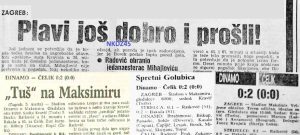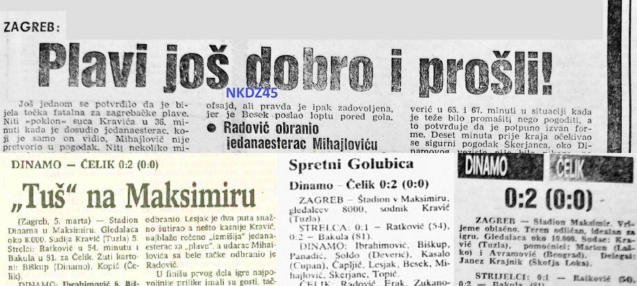 Na suprotnoj strani je nesavladivi Radović odbranio udarce Deverića i Škerjanca, prije nego su Zeničani nokautirali favorita. Ponovo je u glavnoj ulozi bio neuhvatljivi Golubica, ovaj put po lijevoj strani, gdje je izlomio Cupana, centrirao na glavu Marijana Bakule, koji je preciznim udarcem postavio konačan rezultat (0:2). Bila je to možda najveća pobjeda Čelika u posljednjoj sezoni zeničkog kluba u Prvoj ligi Jugoslavije. Dinamo i Čelik više nisu igrali zvanične utakmice, a međusobni bilans zaključen je omjerom pobjeda 13:8 za zagrebački klub.