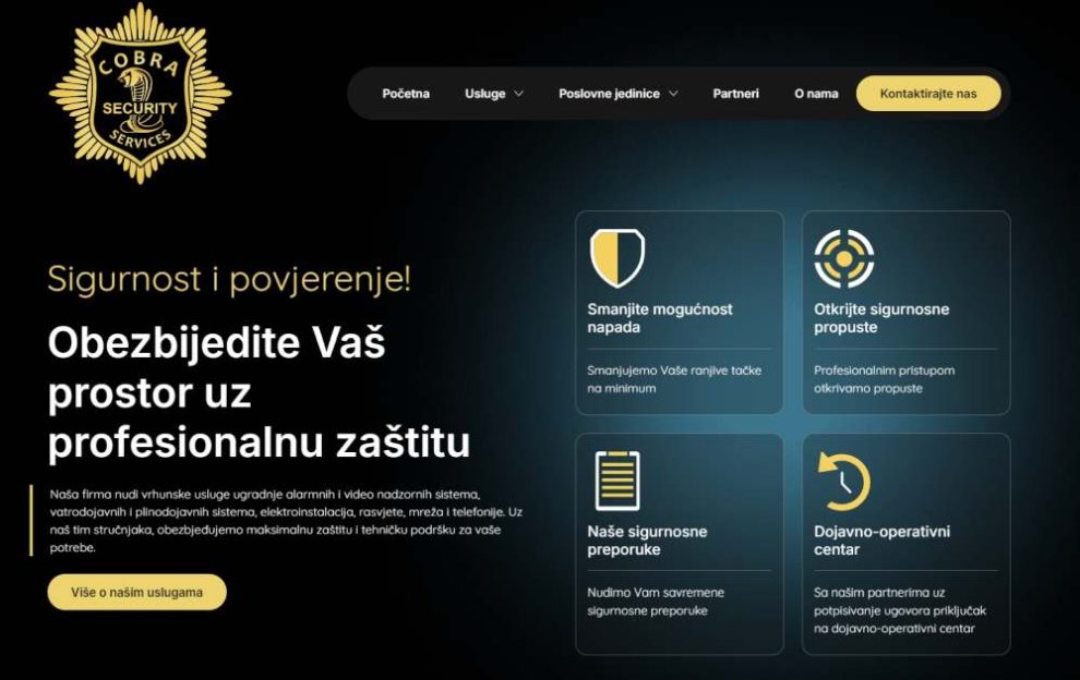 Uključujući niz stručnosti u oblasti sigurnosti, Cobra Security Services vrhunska je kompanija za pružanje takvih usluga – Naša kompanija specijalizovana je za ugradnju video nadzora, alarma i ostalih sigurnosnih sistema, pružajući vrhunska sigurnosna rješenja.
