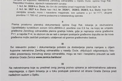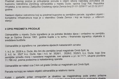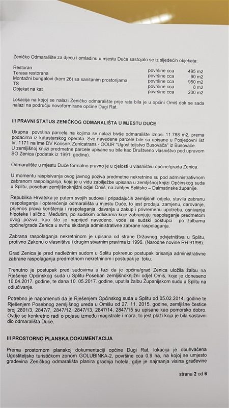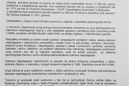 Predsjednik Komisije za pripremu i provođenje procedura međunarodnog tendera za prodaju odmarališta “Duće” gdin. Mirsad Heleg izvijestio je prisutne da je ovo odmaralište u vlasništvu grada Zenica. Naveo je da postoji administrativna zabrana upisana na zahtjev Državnog odvjetništva u Splitu koja nije u skladu s odredbama Zakona o vlasništvu i drugim stvarnim pravima iz 1996.godine, koje propisuju da je vlasništvo nepovredivo. Nakon otklanjanja administrativne zabrane Grad Zenica može zaključiti ugovor o prodaji.