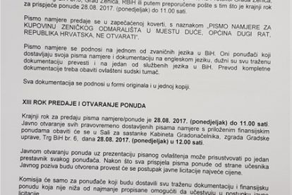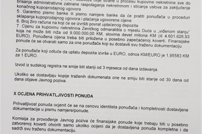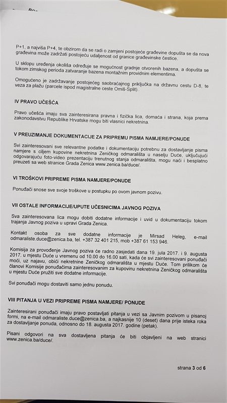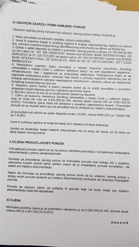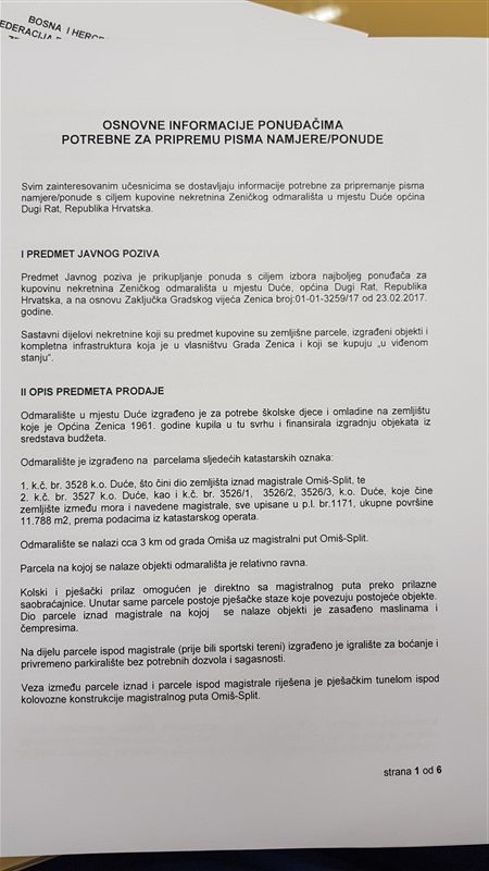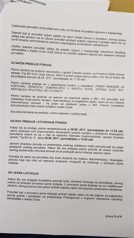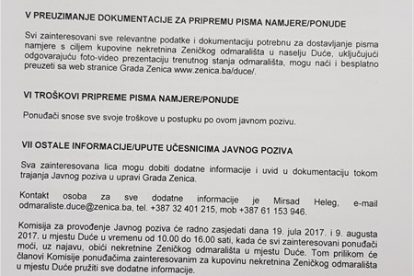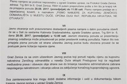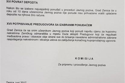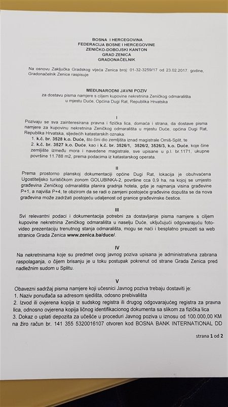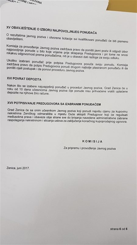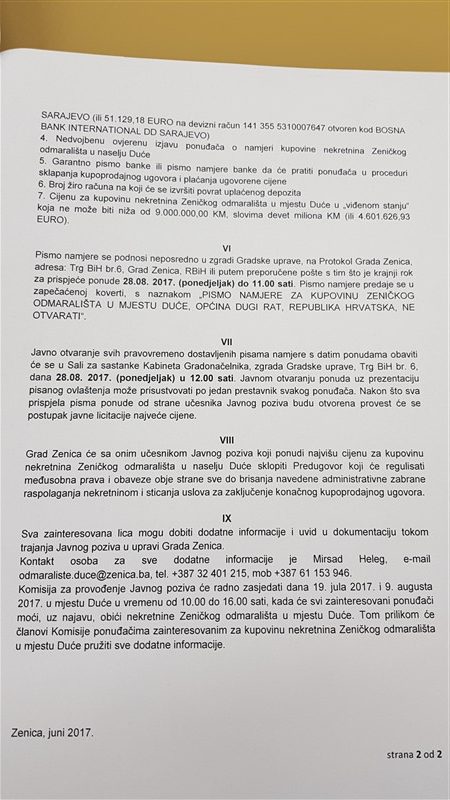 Po završetku međunarodnog javnog poziva najbolji ponuđač sklopit će sa Gradom Zenica Predugovor o kupovini. Predugovor će regulisati međusobna prava i obaveze obje strane sve do brisanja administrativne zabrane i sticanja uslova za zaključenje konačnog kupoprodajnog ugovora. Početnu cijenu komisija je formirala na osnovu procjene stalne sudske vještakinje. Cijena za kupovinu nekretnina Zeničkog odmarališta u mjestu Duće u “viđenom stanju” ne može biti niža od devet miliona KM. Javno otvaranje ponuda održat će se 28. avgusta 2017.godine.