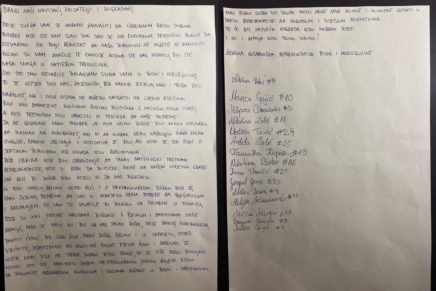“Dragi naši navijači, prijatelji i sugrađani, Prije svega vam se moramo zahvaliti na ogromnom broju poruka podrške koje ste nam slali dok smo se na Evropskom prvenstvu borile da ostvarimo što bolji rezultat za našu domovinu. Ne možete ni zamisliti koliko su nam značile te emocije kojima ste nas hranili, bili ste naša snaga u najtežim trenucima. Ovo što smo ostvarile poklanjamo svima vama u Bosni i Hercegovini, to je uspjeh svih nas. Zajednički, bez ikakvih podjela, kako i treba biti. Nažalost, ima i onih kojima ne možemo uzvratiti na lijepim riječima.