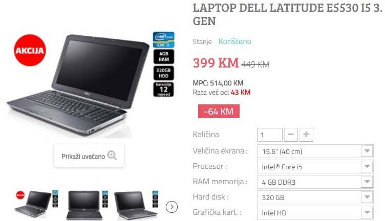 Laptop Dell Latitude E5530 posjeduje procesor Intel i5 treće generacije, 4 GB rama i 320 GB HDD-a, a sa Full HD rezolucijom i osvjetljenjem na tastaturi jednostavno ćete uživati.