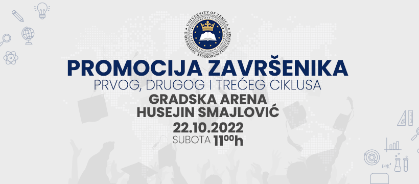 Izuzetna nam je čast i veliko zadovoljstvo pozvati vas na zajedničku Promociju završenika sva tri ciklusa studija na Univerzitetu u Zenici, koja će se održati u subotu, 22.10.2022. godine s početkom u 11 sati u Gradskoj areni Husejin Smajlović.