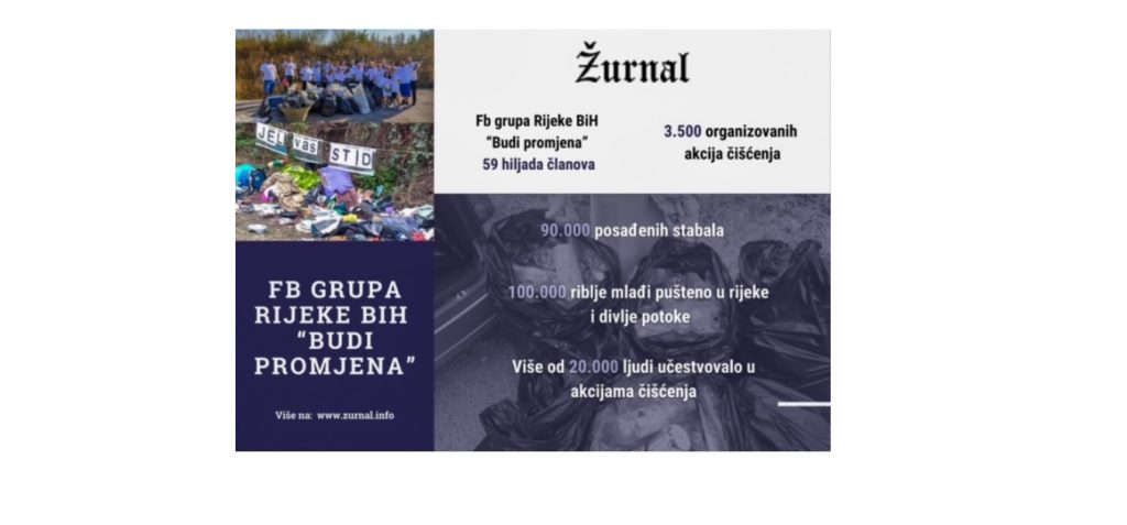Aktivisti i članovi grupe Rijeke Bosne i Hercegovine „Budi promjena“ realizovali tri i po hiljade različitih akcija čišćenja na području Bosne i Hercegovine, zasadili su više od 90 hiljada stabala, pustili u rijeke i divlje potoke 100 hiljada riblje malđi, podnijeli su više od 500 prijava protiv fizičkih i pravnih lica nadležnim organima, postavili su veliki broj tabli, pisali peticije, vršili i vrše pritisak na institucije.