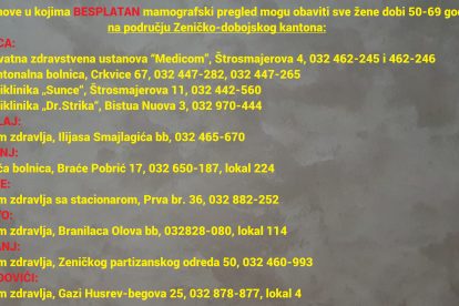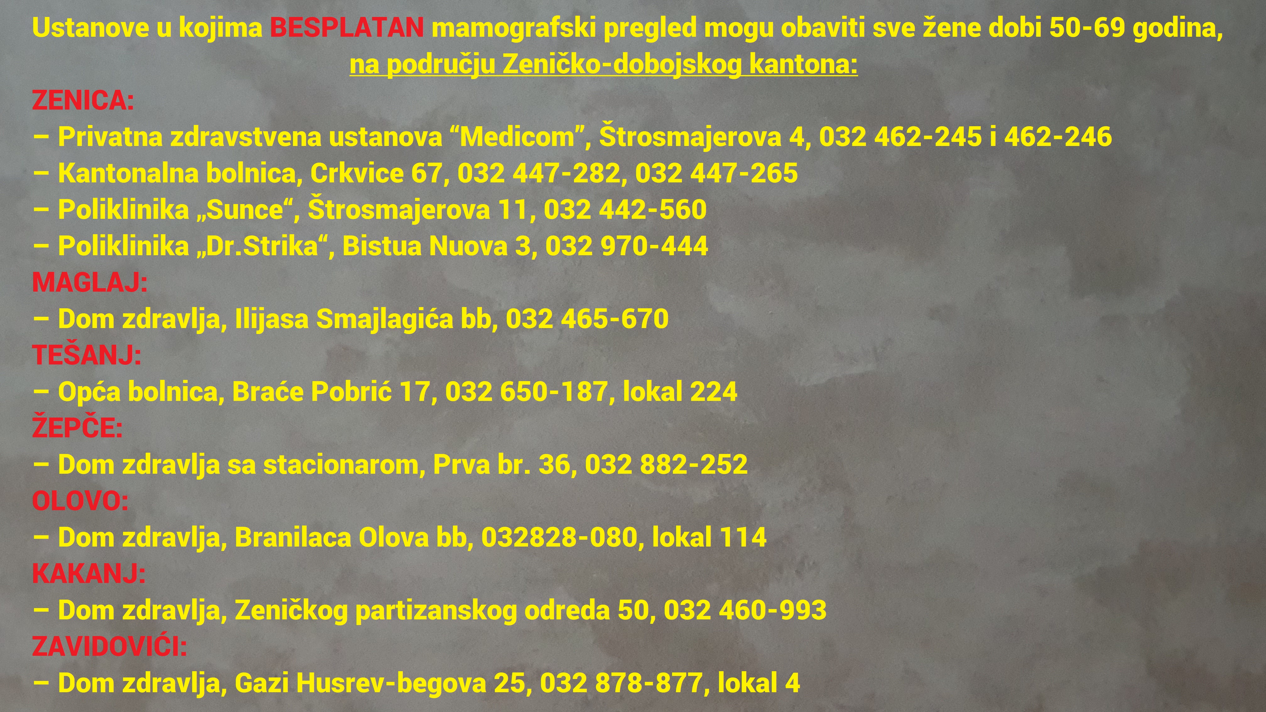Besplatni mamografski pregledi se mogu obaviti u deset zdravstvenih ustanova u ZDK, a odnose se na sve stanovnice ZDK starosti 50 do 69 godina, sa ovjerenom zdravstenom knjižicom. Projekt realizuju Zavod zdravstvenog osiguranja Zeničko-dobojskog kantona (ZZO ZDK) u saradnji sa Institutom za zdravlje i sigurnost hrane Zenica (INZ) i partnerskim privatnim i državnim zdravstvenim ustanovama u Zenici, Maglaju, Tešnju, Žepču, Olovu, Kaknju i Zavidovićima.