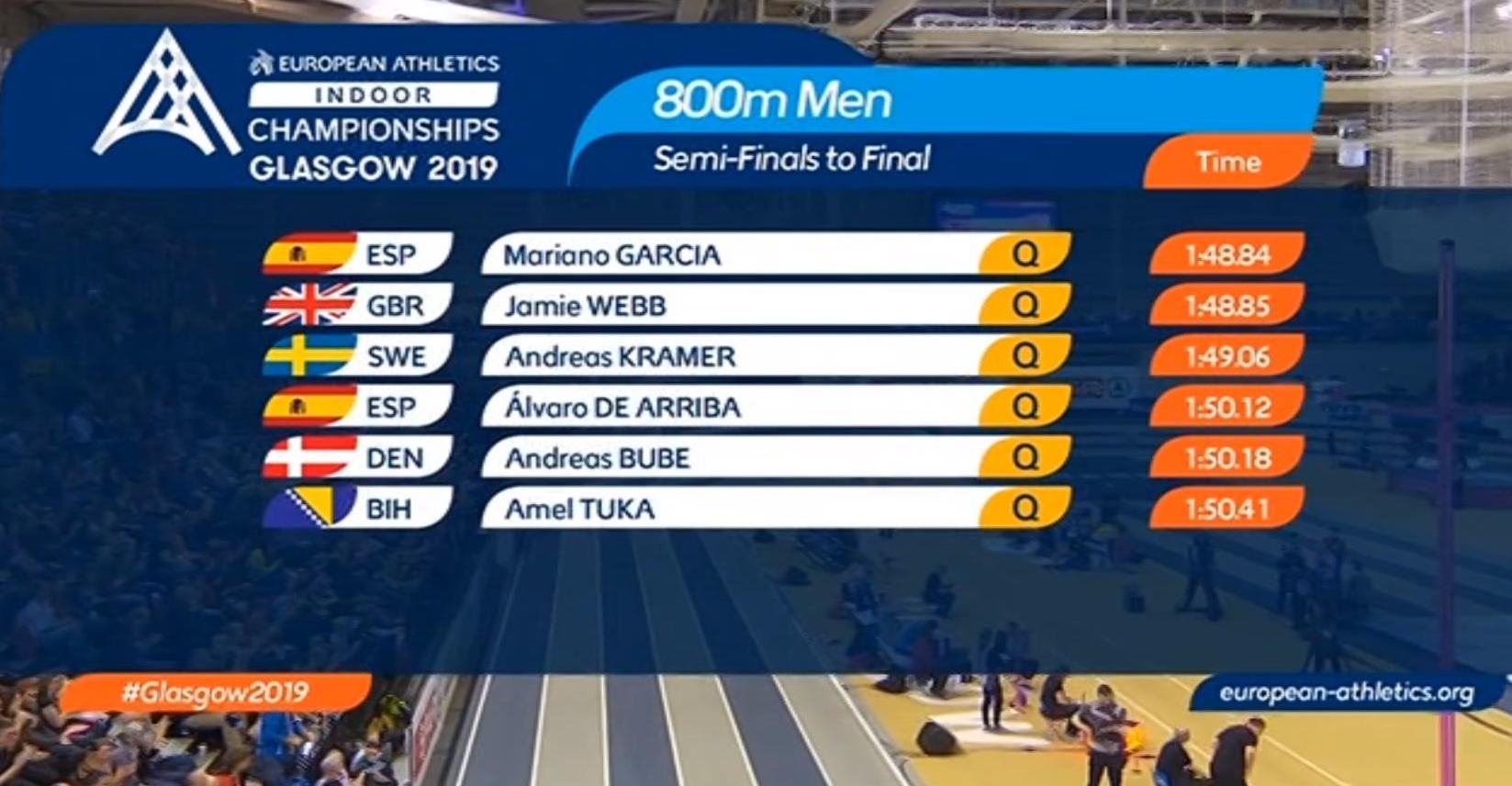 Tuka je u petak uvečer u kvalifikacijama istrčao najbolje vrijeme, a večeras je uspio da se domogne jedne od pozicija u svojoj grupi koja vodi među šest najboljih. Prvi je danas bio De Arriba (1:50.12), drugi Bube (1:50.18), a Tuka je ostvario vrijeme 1:50.41, što je za samo 21 stotinku bolje od Kesslera koji se nije uspio plasirati u finale. Finale je na rasporedu u nedjelju od 19:57 sati, a uz Tuku, De Arribu i Bubea u njemu će se takmičiti i Mariano Garcia, Jamie Webb i Andreas Kramer.