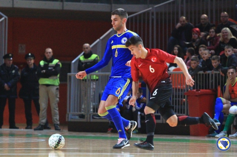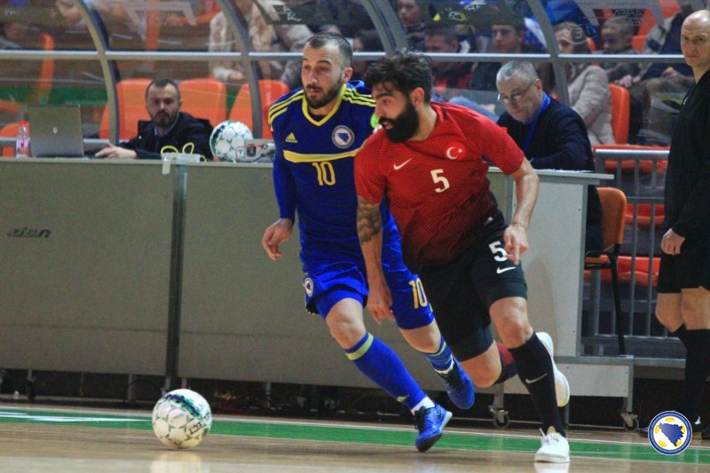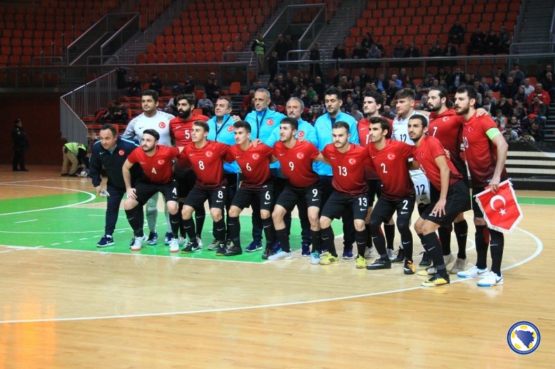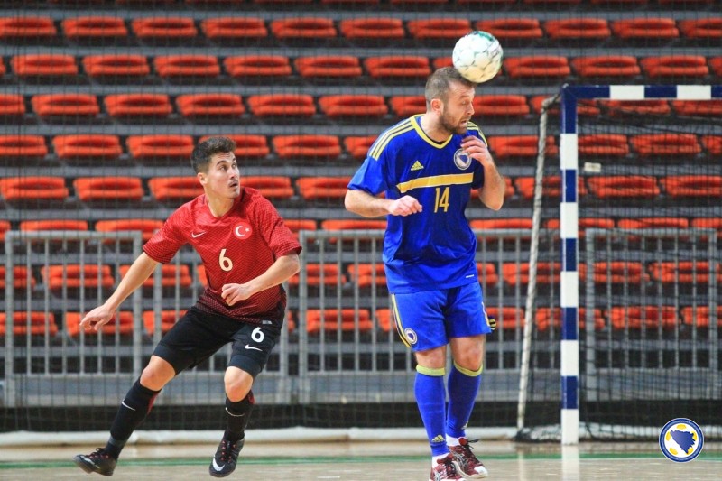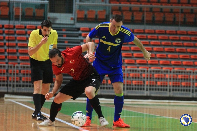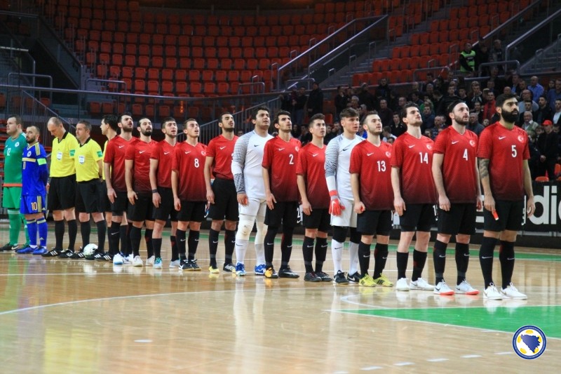 Bh. tim je imao inicijativu tokom čitavog prvog poluvremena i čak 20 šuteva više od protivnika, ali drugi gol je postignut tek u 20’. Strijelac je još jednom bio Kahvedžić, ovaj put na asistenciju Dejana Pavlovića. Na 3:0 povisio je kapiten Anel Radmilović u 23’ odličnim šutem osam metara iskosa sa desne strane. Isti igrač minutu poslije postiže još jedan gol, a oba je asistirao Pavlović. Bilal Jelić je u 27’ povukao loptu sa svoje polovice, došao do šesterac i pogodio za 5:0. Muhammet Furkan Ozkan u 30’ prolazi i pored golmana Milanovića i postiže prvi gol za Tursku. Odličnu akciju u 32’ izveli su bh. reprezentativci. Radmilović je poslao loptu na lijevu stranu do Kahveždića, a ovaj je vraća na šesterac gdje je natrčao Marijo Aladžić i poslao loptu iza leđa golmana Erkana Cinara. U 33’ Jelić sa desne strane šalje loptu na suprotnu stativu gde je spremno dočekao Kahvežić i postigao gol za 7:1. Cenk Sen u 37’ smanjuje prednost bh. tima na 2:7. To je bio i konačan rezultat utakmice.