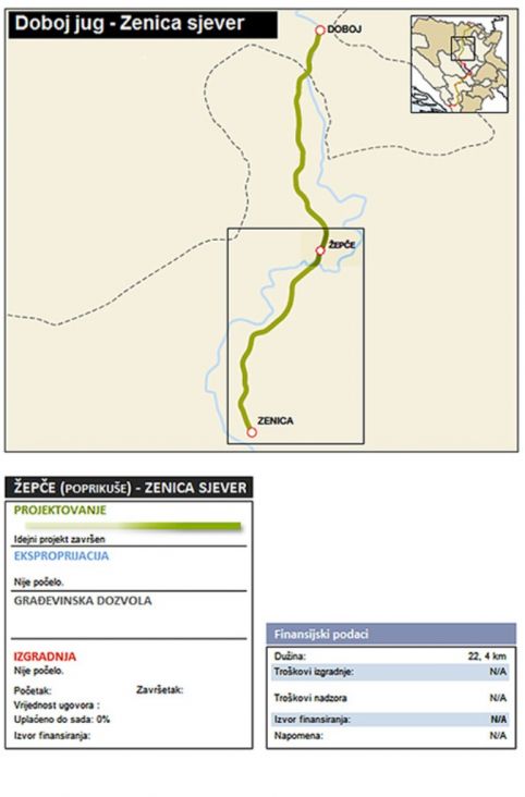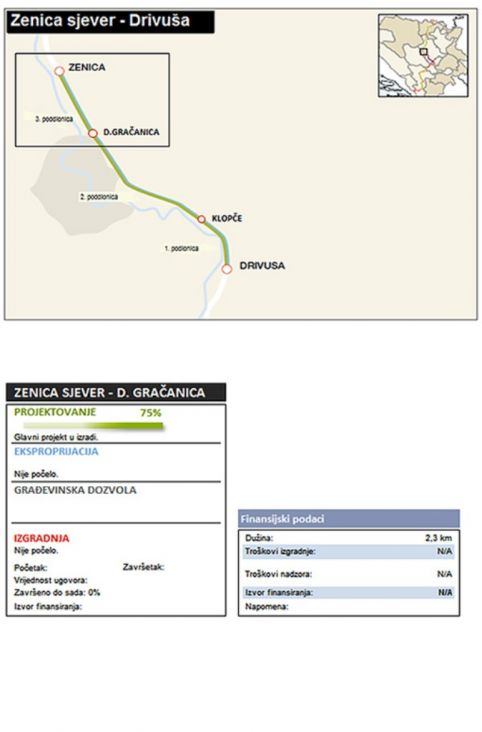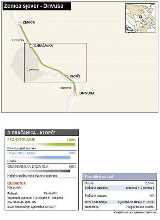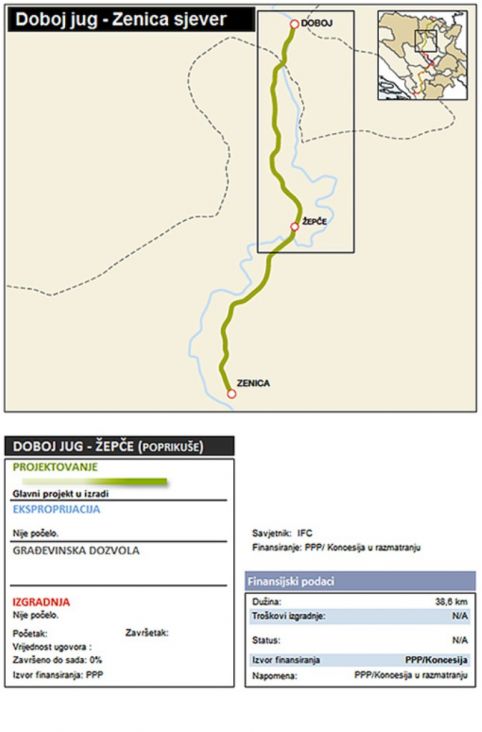 Dionica Nemila – Zenica sjever (izlaz iz tunela Zenica) podijeljena je na tri lota i pokrenuta je inicijativa za zaduženje kod tri različite međunarodne finansijske institucije: EBRD u visini od 80 miliona eura, OFID – Opec fond za međunarodni razvoj u visini od 49 miliona eura i KFAED u visini 36 miliona eura.