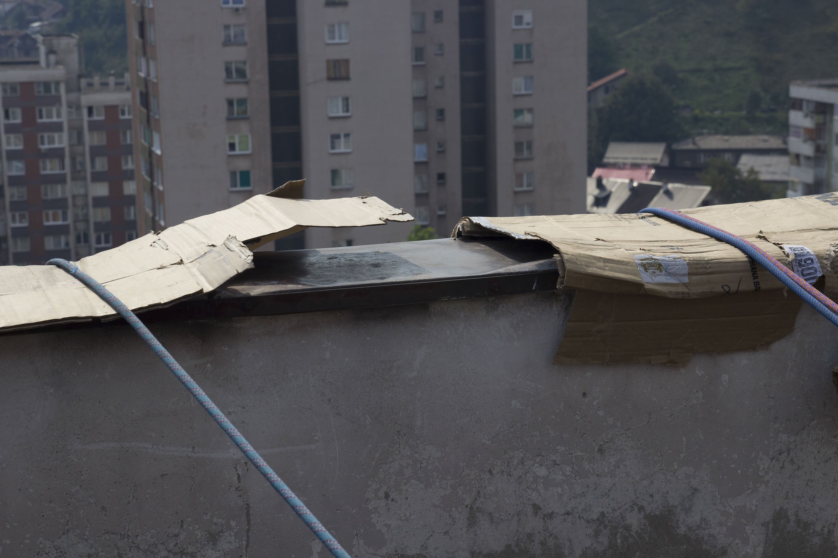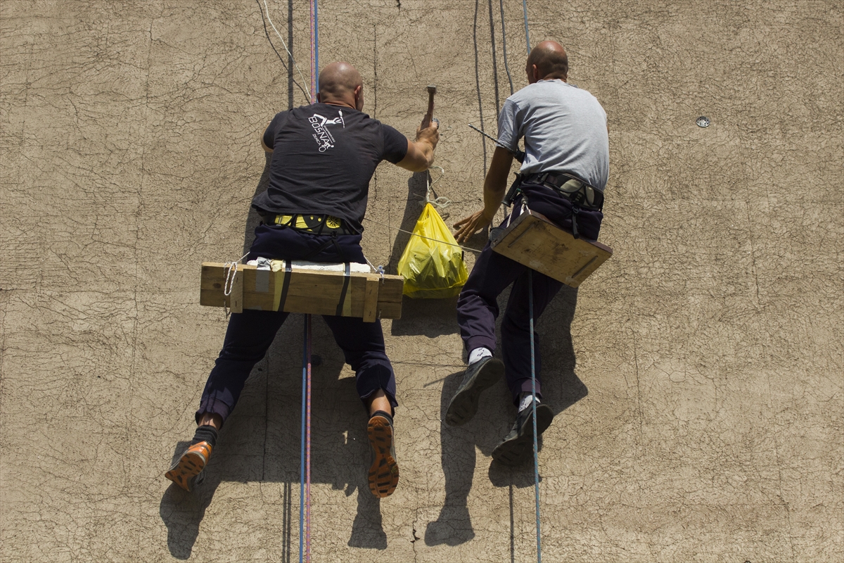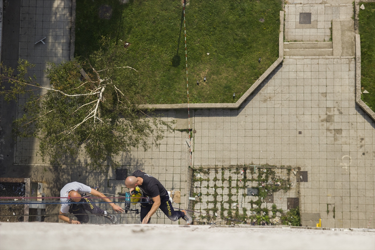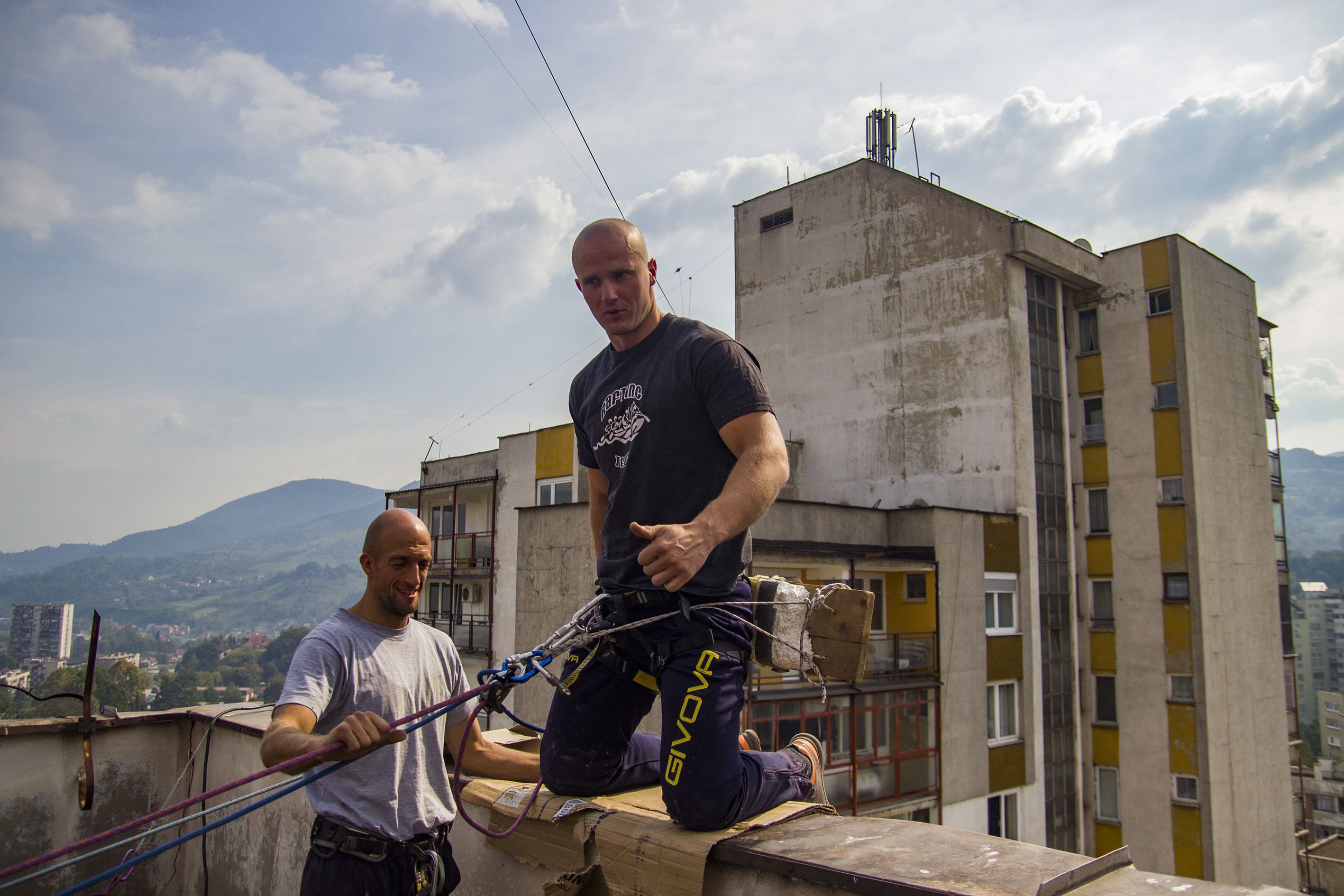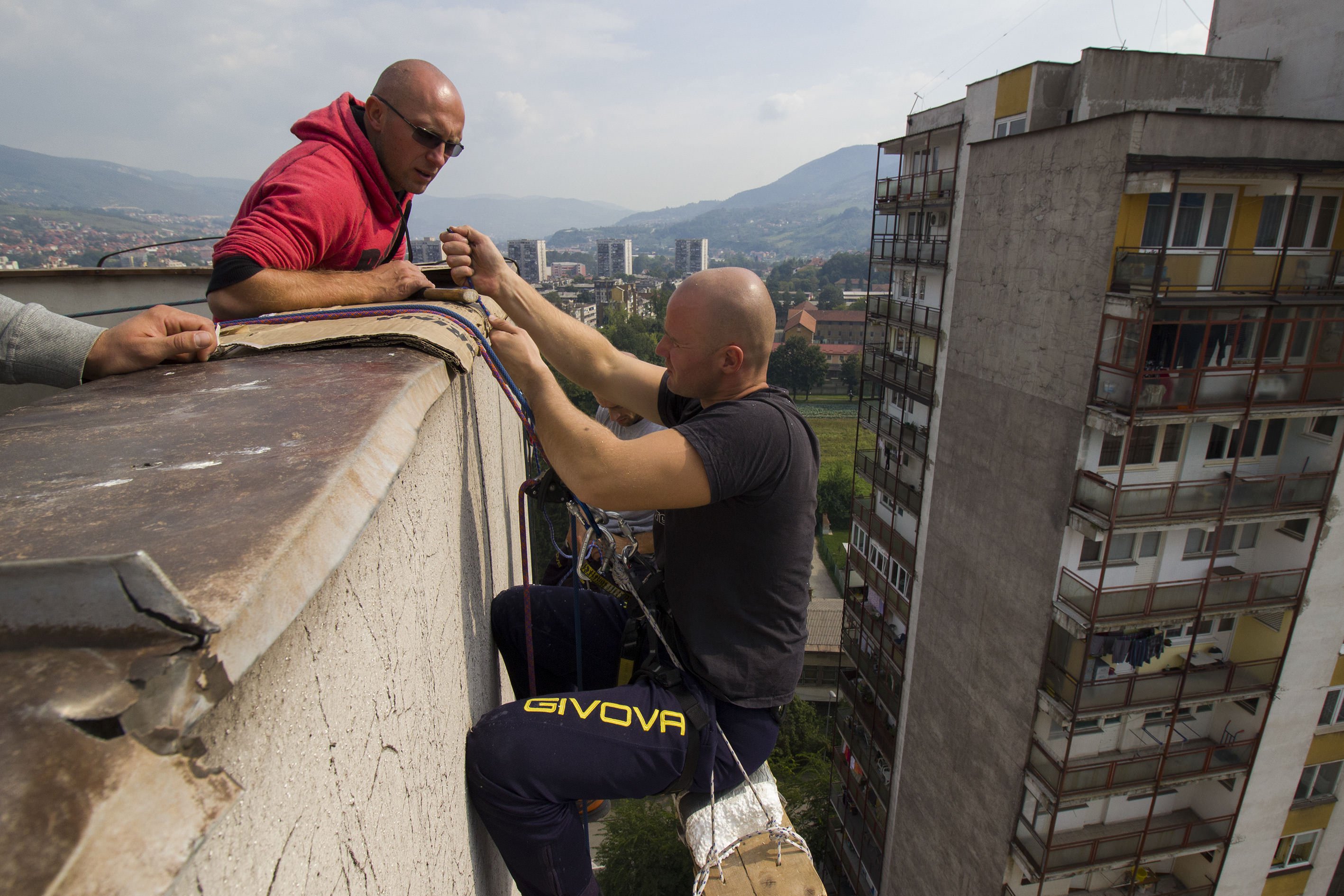 Rade se posljednje provjere užadi, kopči, nakon čega Vinovčić i Smriko prelaze preko ograde terase i počinju se spuštati niz fasadu zgrade kako bi izbušili nove rupe za klinove kojima će pričvrstiti fasadu.