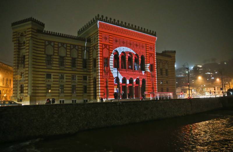 Grad Sarajevo odlučio je odati počast žrtvama terorističkih napada koji su se dogodili u Istanbulu stoga je Vijećnica obasjana bojama turske zastave ( Mustafa Öztürk – Anadolu Agency )