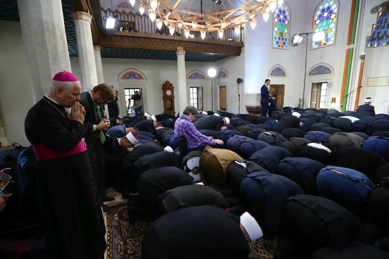 Banjalučki biskup Franjo Komarica u Ferhad pašinoj džamiji u Banjaluci tokom podne namaza nakon što je svečanom ceremonijom zvanično otvorena džamija na Vrbasu koja je 7. maja 1993. srušena tokom rata u BiH. ( Hakan Göktepe – Anadolu Agency )