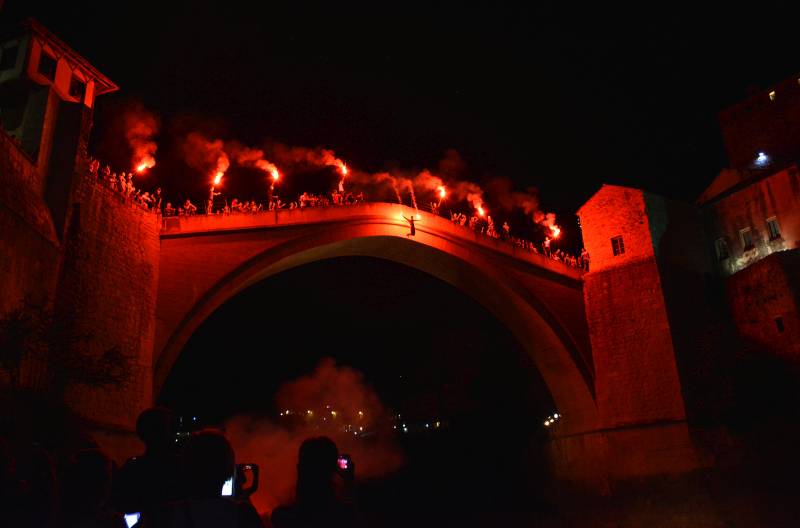 Tradicionalnim skokom uz baklje i pjesmu “Čudna jada od Mostara grada” iskusni skakač Admir Delić svečano je zatvorio manifestaciju jubilarnih 450. visinskih skokova sa Starog mosta u Mostaru. ( D. Maric – Anadolu Agency )