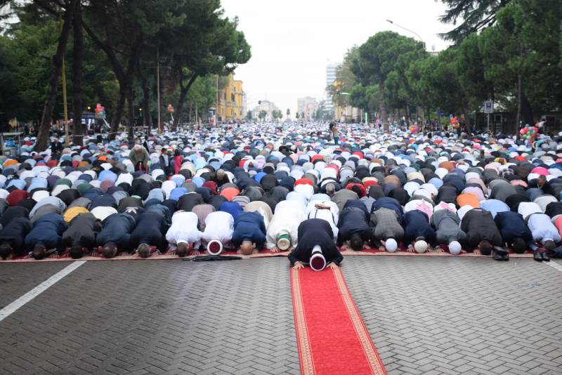 Nekoliko hiljada albanskih muslimana na najvećem bulevaru u Tirani klanjalo je bajram-namaz ( Olsi Shehu – Anadolu Agency )