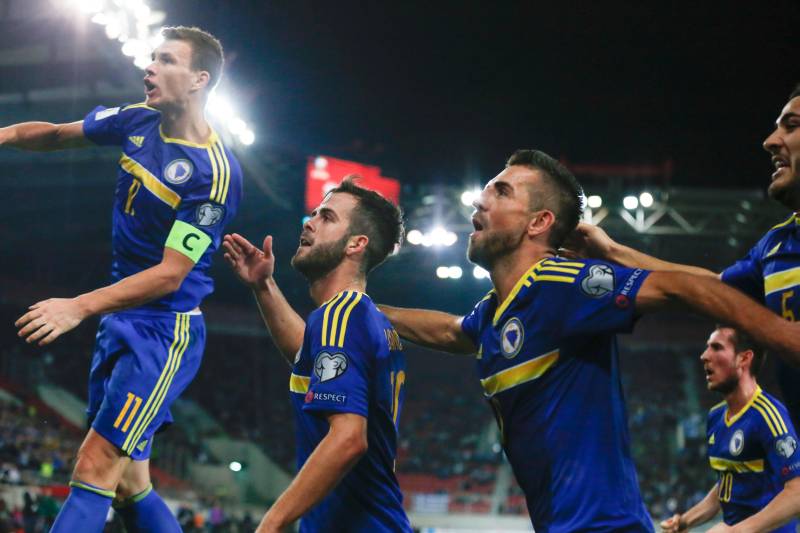 Fudbaleri reprezentacije BiH proslavljaju vodeći gol u duelu protiv Grčke u Atini u okviru kvalifikacione utakmice četvrtog kola za Svjetsko prvenstvo u Rusiji 2018. godine na stadionu “Georgios Karaiskakis”. ( Elman Omiç – Anadolu Agency )