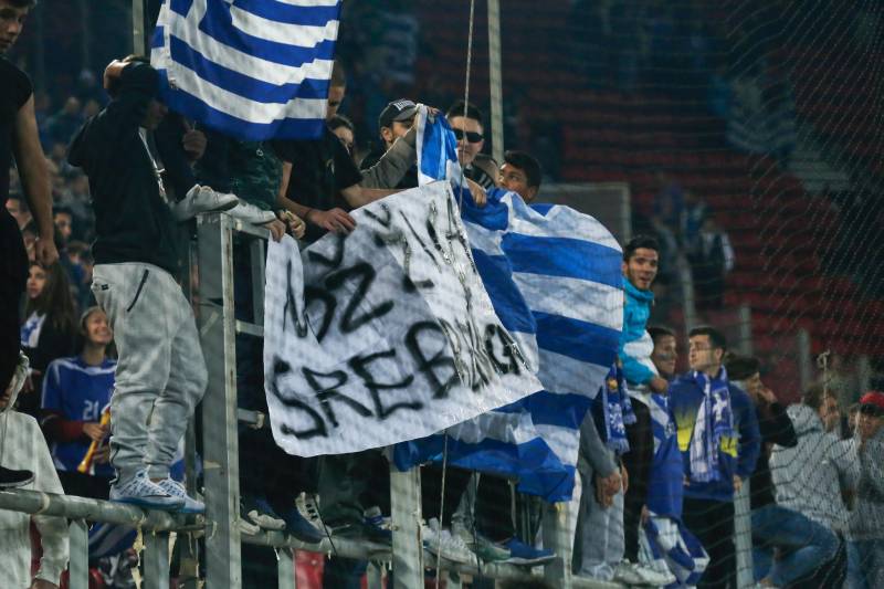 Grčki navijači na stadionu “Georgios Karaiskakis“ tokom fudbalske utakmice između Grčke i BiH na nekoliko mjesta na tribinama istakli su simbole četničkog pokreta, a iza gola golmana bh. tima Asmira Begovića stajao je i transparent sa skandaloznom porukom “Nož, žica, Srebrenica“ ( Elman Omiç – Anadolu Agency )