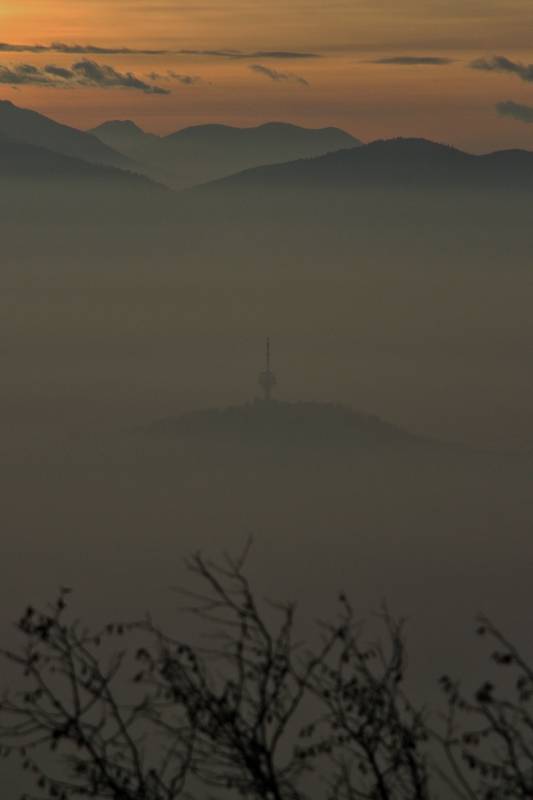 Fotorepotrer AA kroz svoj objektiv zabilježio je momente zalaska sunca sa Čavljaka, dok se gusta magla prostire duž sarajevske kotline i podsjeća na nepreglednu morsku pučinu. Jedino što nije nestalo u magli je Relej na Humu, jedan od simbola grada. ( Kemal Zorlak – Anadolu Agency )