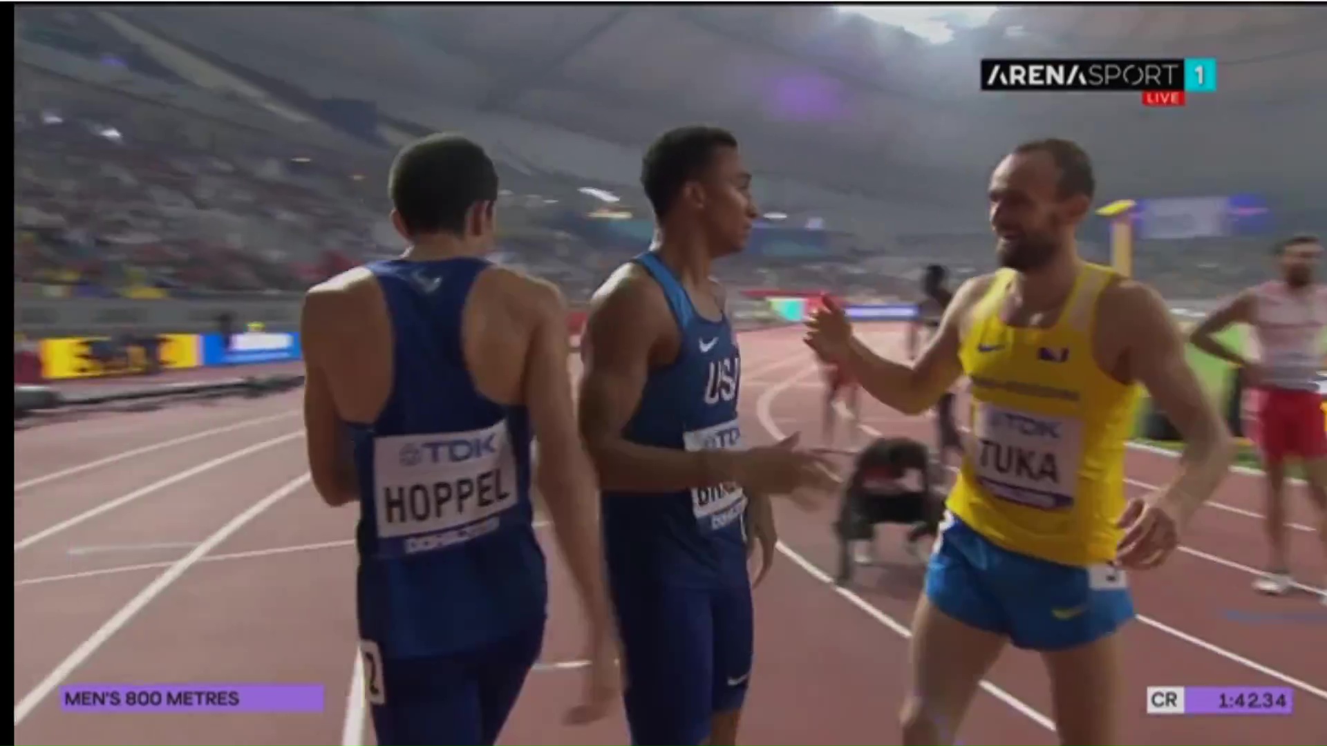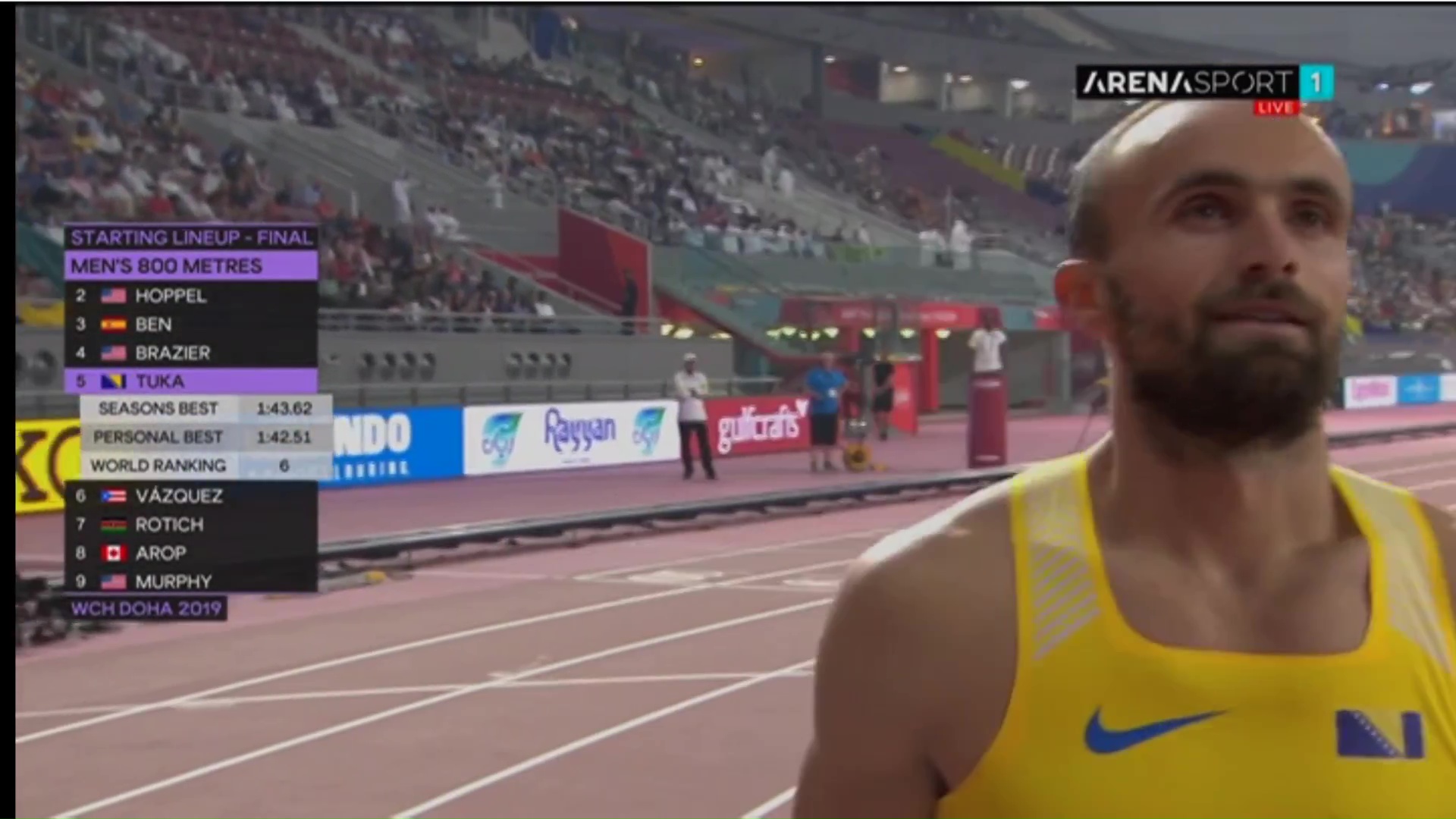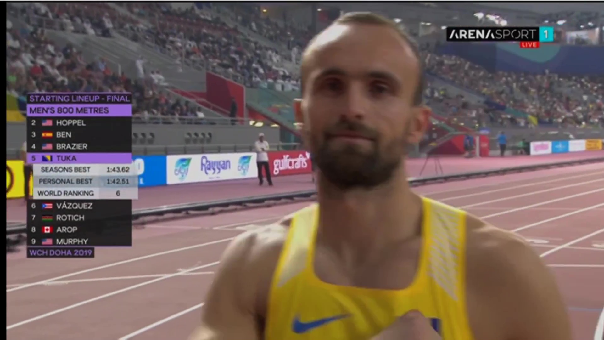 Podsjećamo, Tuka je osvojio prvo mjesto u nedjelju u svojoj polufinalnoj grupi s vremenom 1:45:63 i na taj način izborio plasman među najboljih osam 800-metraša. U finalu su nastupili: Wesley Vazquez (Prt), Ferguson Cheruiyot Rotich (Ken), Clayton Murphy (SAD), Donavan Brazier (SAD), Amel Tuka (BiH), Marco Arop (Kan), Bryce Hoppel (SAD) i Adrian Ben (Špa).