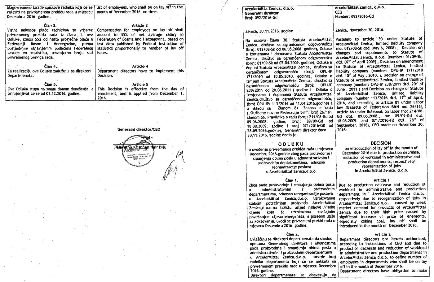 U Odluci Uprave o privremenom prekidu rada, koju je potpisao generalni direktor Biju Nair se navodi da se ona donosi zbog “pada proizvodnje i smanjenja obima posla”.