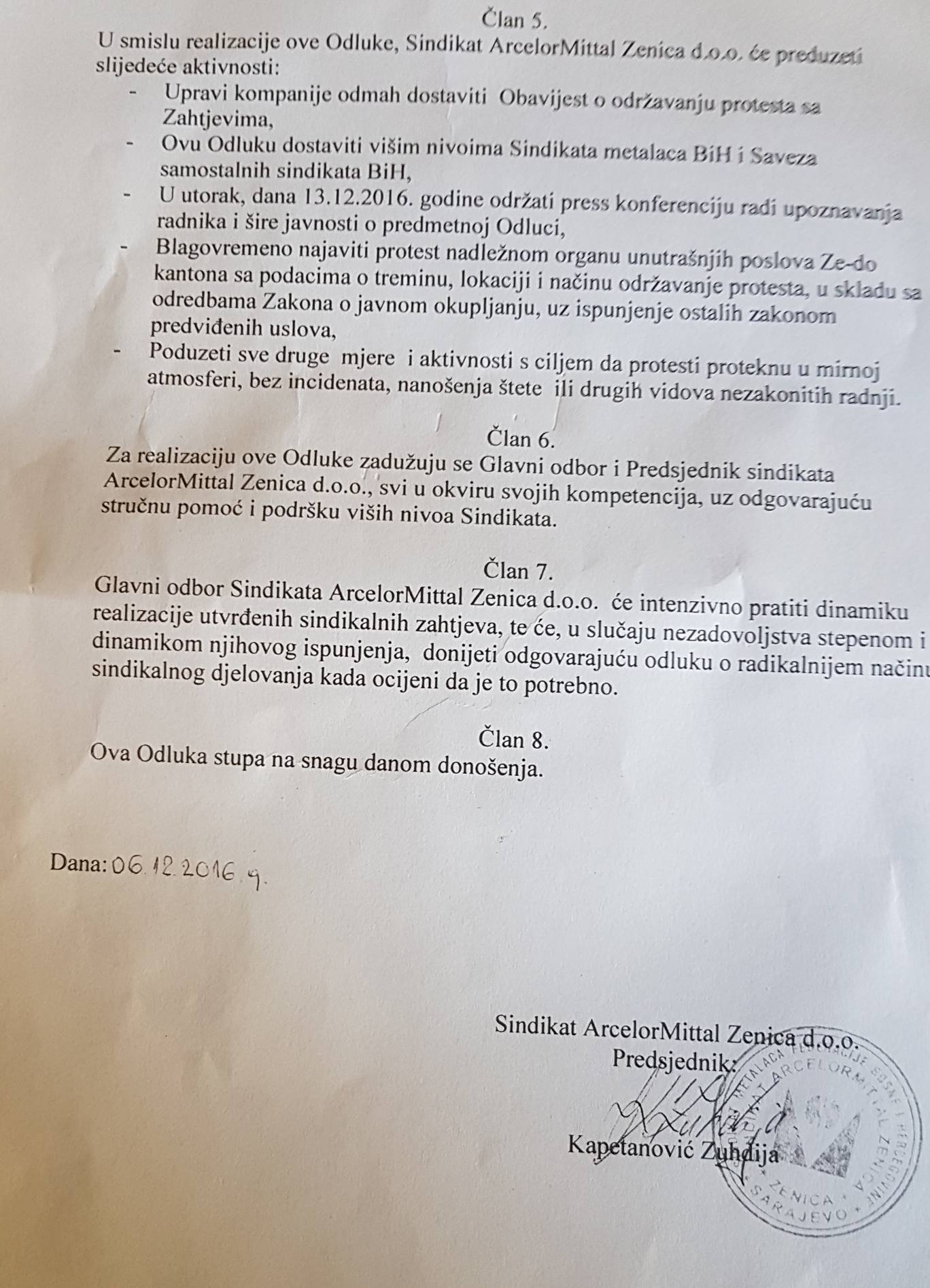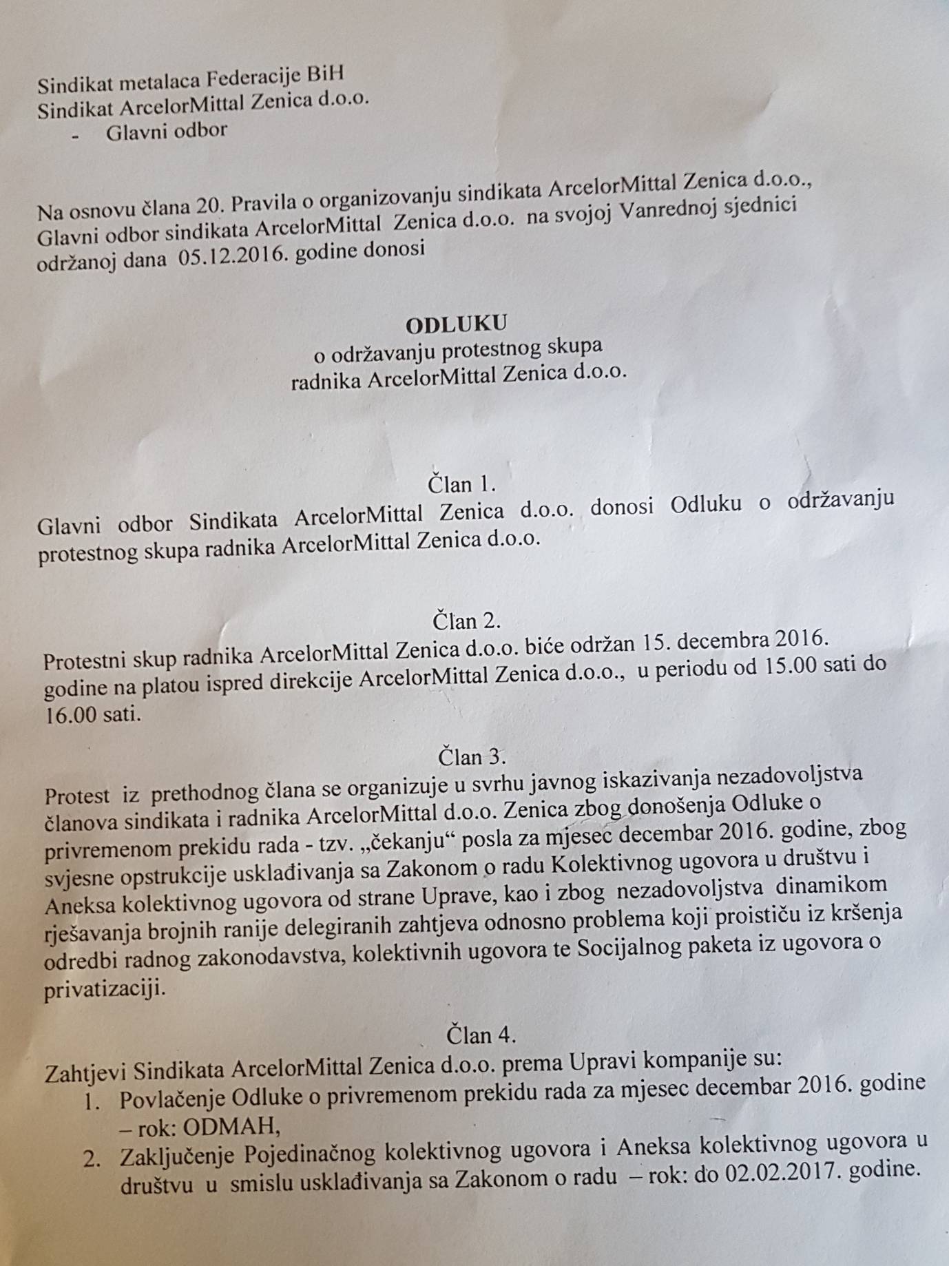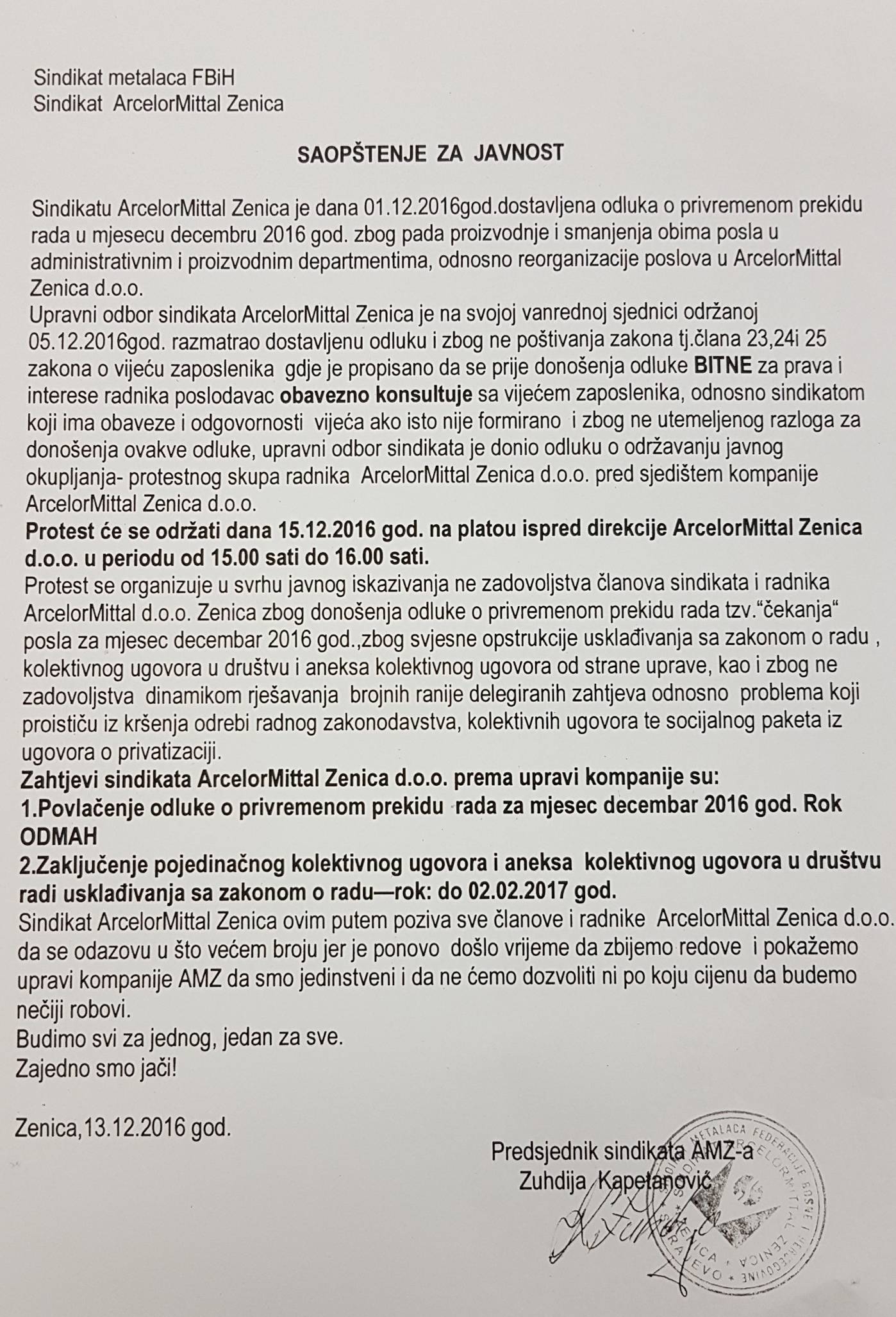 VIDEO+FOTO: Jednosatni protest radnika AMZ u četvrtak u 15 sati – Sindikat ArcelorMittal Zenica donio je odluku o održavanju jednosatnog protestnog skupa radnika ove kompanije u četvrtak, 15. decembra u 15 sati ispred direkcije kompanije, saopćeno je na današnjoj pres konferenciji.