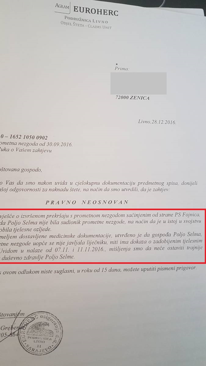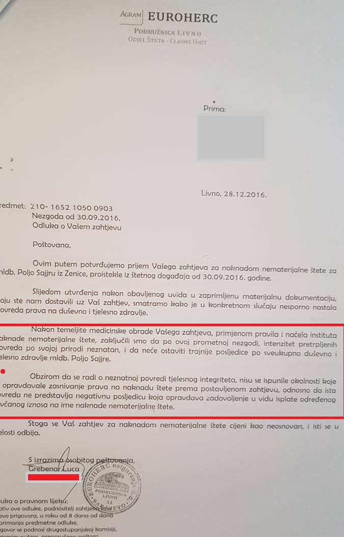 U drugom, fojničkom slučaju se kaže da “udes neće ostaviti posljedica na već loše stanje”, što pokazuje da su osiguravatelji preko noći postali ljekari, psiholozi…. Izvjesno je da će osiguravajuća društva godinama odugovlačiti da plate odštetu u ime svog klijenta, vozača “Golfa”, čak i kad i ako presuda postane pravosnažna. Ipak, zabrinjava da barem u ovakvim slučajevima, dok je cijela država organizovala akcije za malenu Sajjru, nisu pokazali niti trun humanosti.