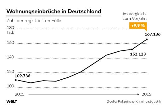 Registrovane su 62,262 provale u 2015. godini samo u Sjevernoj Rajni Vestfaliji; povećanje u odnosu na prethodnu godinu za oko 18 posto. Širom Njemačke, broj provala povećan na više od 167.000, što je povećanje od gotovo deset posto. Ovom vrstom kriminala se bave uglavnom kao sezonski posao bande iz istočne i jugoistočne Europe.