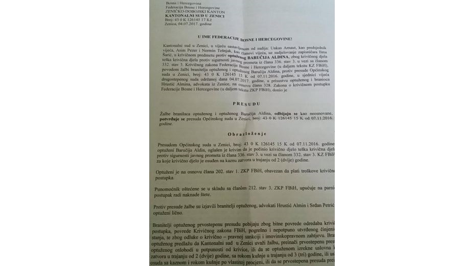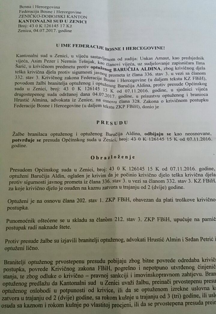 VIDEO+FOTO: Kantonalni sud u Zenici potvrdio presudu – zbog nesreće u kojoj je povrijeđena Sajjra Poljo, Aldinu Baručiji dvije godine zatvora – Kako saznaje Zenicablog, početkom jula vijeće Kantonalnog suda u zenici odbacilo je žalbe branilaca, te u potpunosti potvrdilo prvostepenu presudu protiv Zeničanina Aldina Baručije.