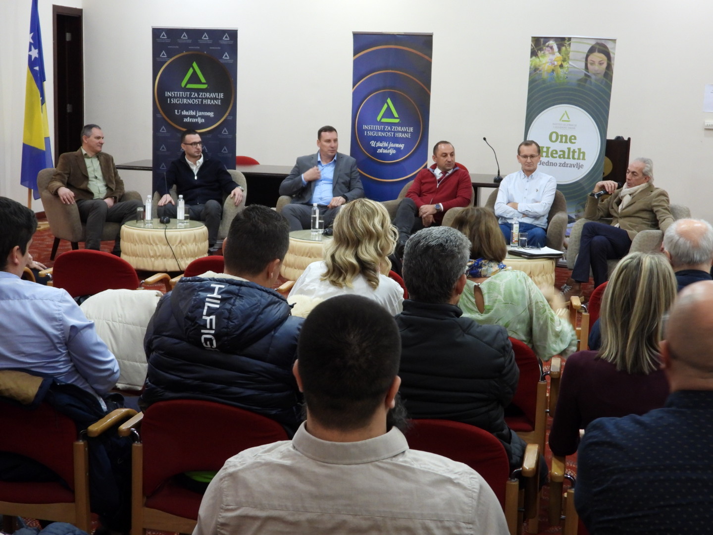 Učesnici panel diskusije bili su prof. dr. Nihad Fejzić (Veterinarski fakultet Sarajevo), Muamer Dervišević (Ured za veterinarstvo BiH), Kenan Muratović (Federalno ministarstvo poljoprivrede, vodoprivrede i šumarstva), Adnan Leto (glavni kantonalni veterinarski inspektor ZDK), dr. Alis Kozica (načelnik Službe za epidemiologiju INZ) i Rusmir Goletić (stručni saradnik za zoohigijenu u INZ i predsjedavajući Balkanske mreže Jednog zdravlja – BOHN). Kroz višesatnu diskusiju predstavljeni su primjeri institucionalnog preklapanja nadležnosti, propusti u preventivi i dijagnostici te nedostatak jasne koordinacije između sektora veterine, epidemiologije i javnog zdravstva.