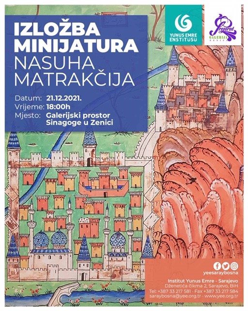 U galerijskom prostoru zeničke Sinagoge otvorena je izložba minijatura Nasuha Matrakčija u saradnji sa Yunuz Emre Institutom Sarajevo. Radi se o reprodukciji 40 minijatura koje je naslikao Nasuh Matrakči. Izložbu je otvorio prof.dr Dževad Drino, član UO Galerija Preporod Zenica. O Nasuhu Matrakčiju govorio je dr.sci Amir Ismić, a ispred Yunuz Emre Instituta Sarajevo obratio se Samed Pasalić. Izložba će biti otvorena od 21. do 23. decembra 2021.godine od 16.00 do 19.00 sati.