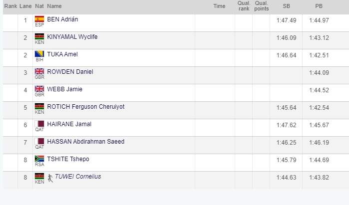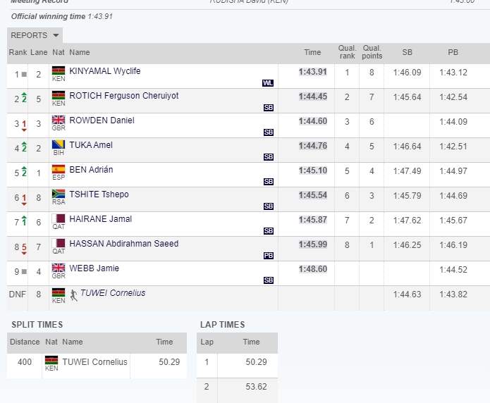 Amel je postigao rezultat 1.44.76 što je skoro dvije sekunde bolje od njegovog najboljeg ovogodišnjeg rezultata. Prvi je bio Wyclife Kinyamal, koji je istrčao 800 metara za 1.43.91, što je najbolji ovogodišnji rezultat u svijetu.
