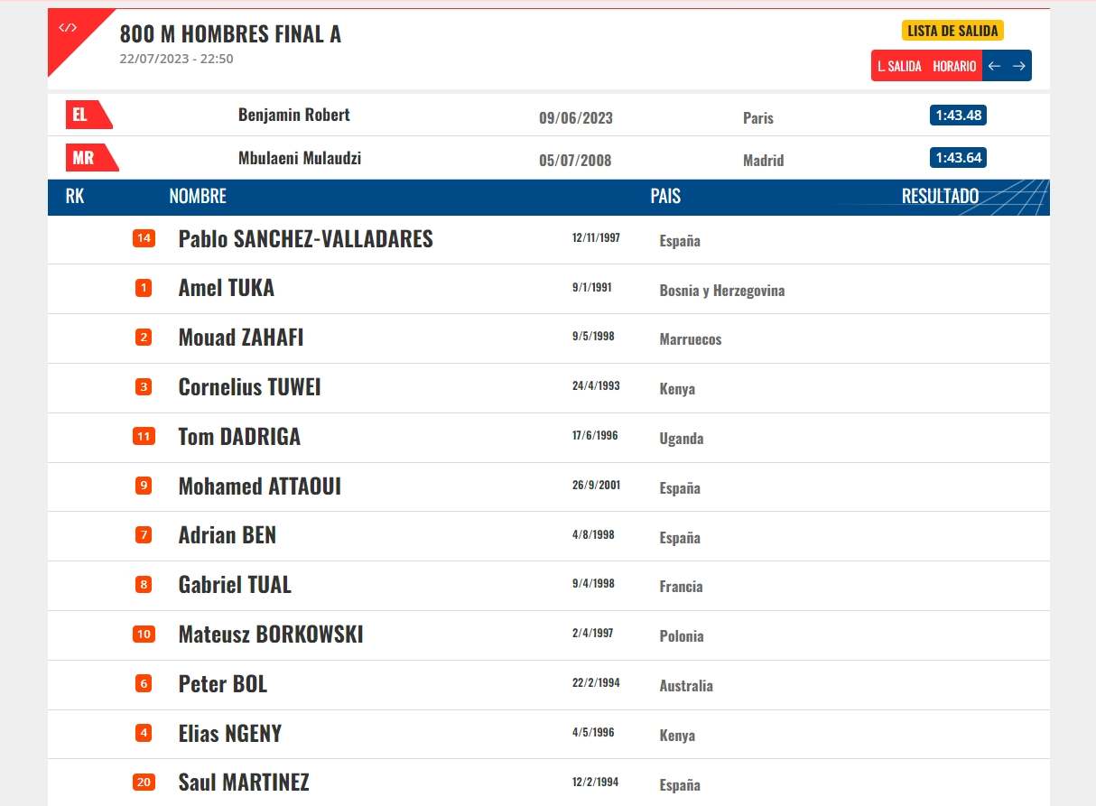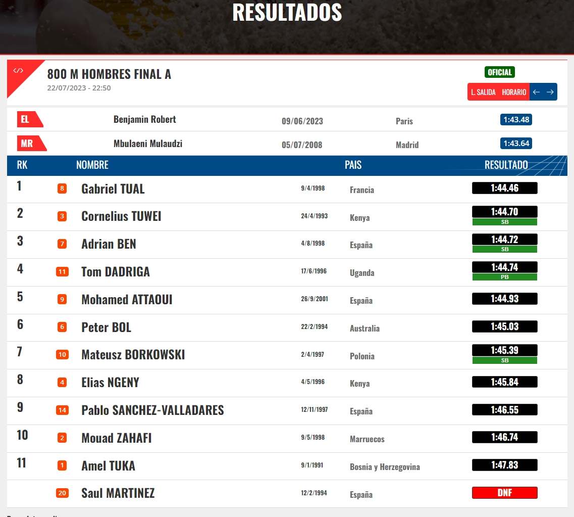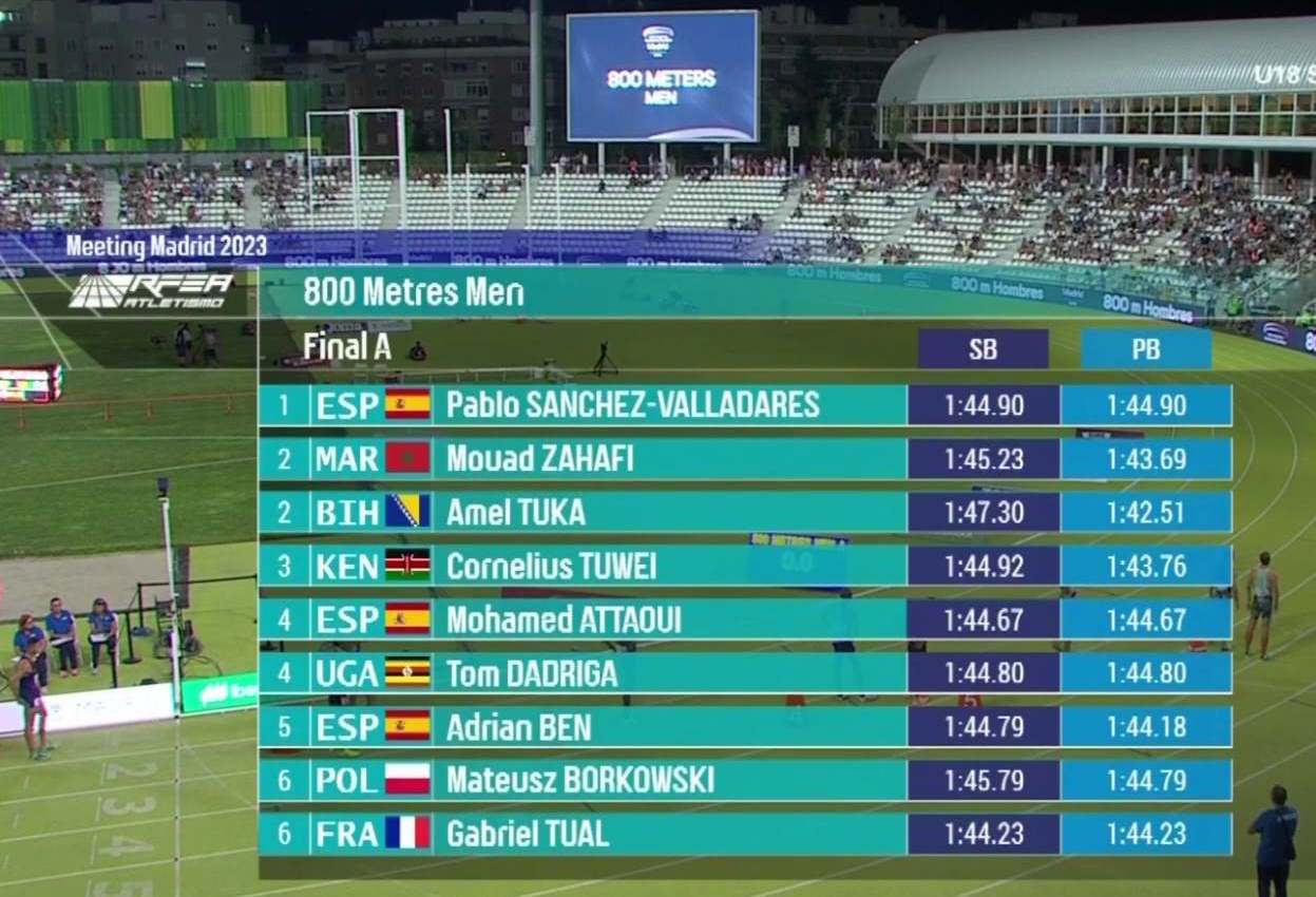 Slavio je Francuz Gabriel Tuar s vremenom 1:44.46, drugi je bio Cornelius Tuwei iz Kenije (1:44.70) dok je treće mjesto zauzeo Španac Adrian Ben (1:44.72). Podsjetimo, Tuka je nedavno na stadionu Mestesky u Ostravi, dionicu 800 metara istrčao u svom najboljem ovosezonskom u vremenu – 1:47.30.