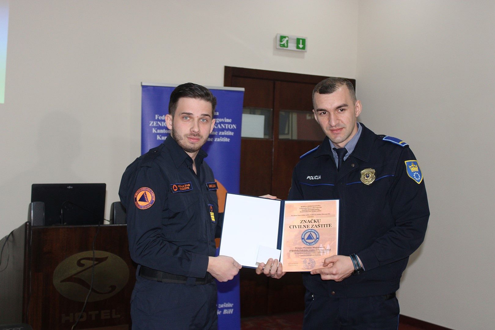 Komandant KŠCZ-a i ministar za prostorno uređenje, promet i komunikacije i zaštitu okoline Arnel Isak uručio je najviše prizannje “Zlatnu značku” Muharemu Hujduru iz Tešnja, članu Dobrovoljnog vatrogasnog društva Jelah, za izuzetan doprinos razvoju sistema zaštite i spašavanja od požara i uspostavljanje Vatrogasnog saveza Zeničko-dobojskog kantona, te Erminu Mujezinoviću, policajcu Policijske stanice Crkvice Zenica, koji je 20. marta 2021. godine spasio trogodišnjeg dječaka od utapanja u rijeci Bosni.