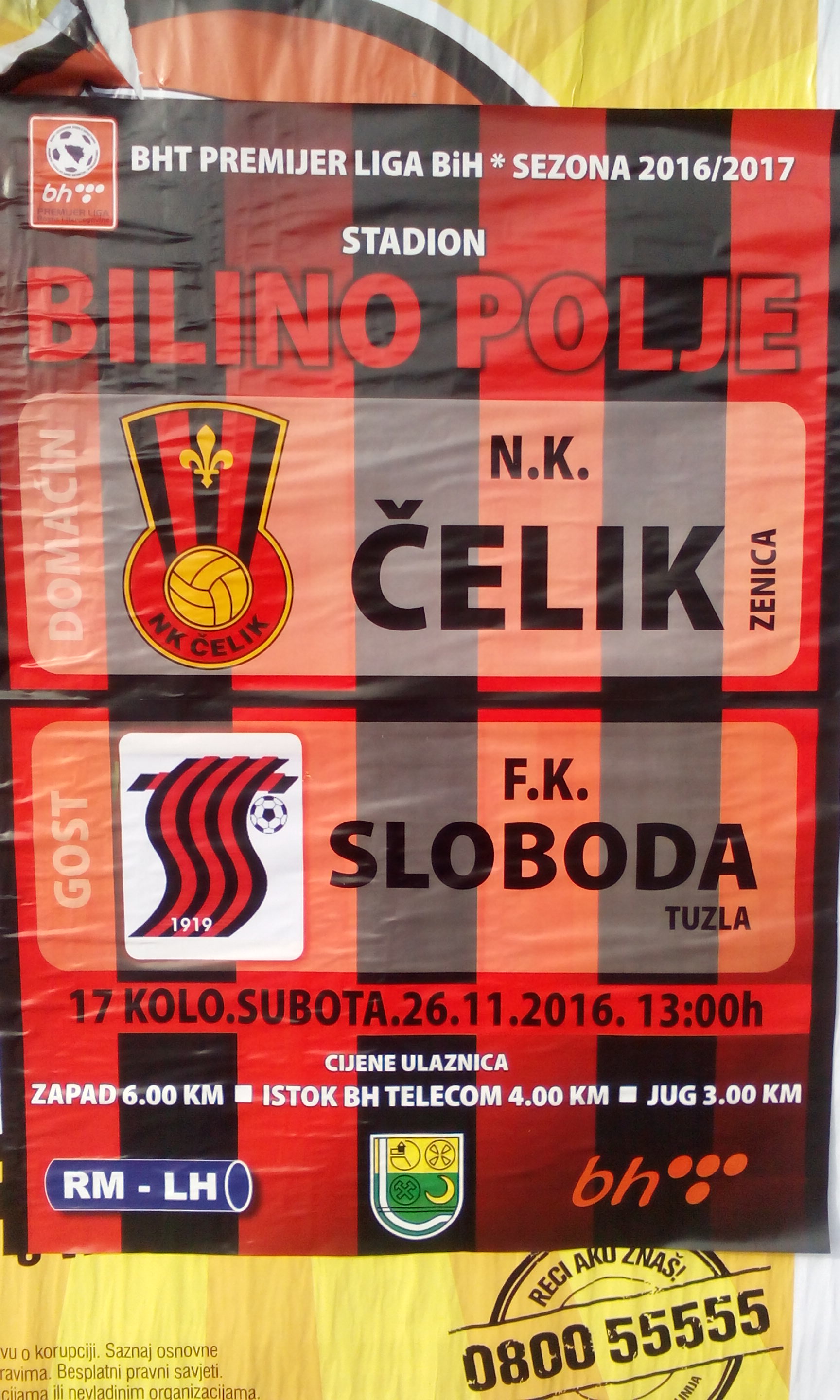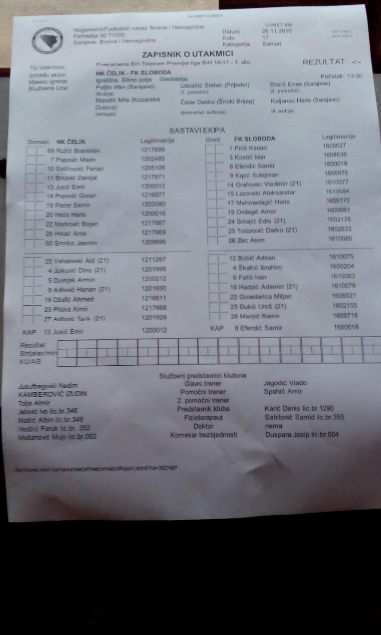 VIDEO+FOTO: Poraz Čelika na Bilinom polju – 17.kolo Premijer lige BiH, NK ČELIK – FK SLOBODA 0:2 ; Stadion: „Bilino polje” u Zenici; Početak u 13 sati; Gledalaca oko 250, (Južna tribina stadiona i dalje bez najvatrenijih navijača Čelika, popularnih Robijaša, a na sjevernoj tribini oko 20-ak navijača Slobode-Fukara). Vrijeme oblačno i kišovito (+12*C). Sudije: Glavni sudija Irfan Peljto (Sarajevo), pomoćnici, A1 Sreten Udovičić (Prijedor), A2 Enes Đozić (Sarajevo), delegat Mile Mandić (Koz.Dubica).