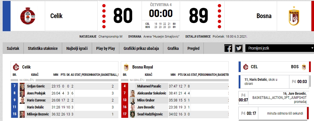 Konačan rezultat i rezultati po četvrtinama: OKK Čelik – KK Bosna Royal  80:89 (18:23), (19:23), (22:20), (21:23);