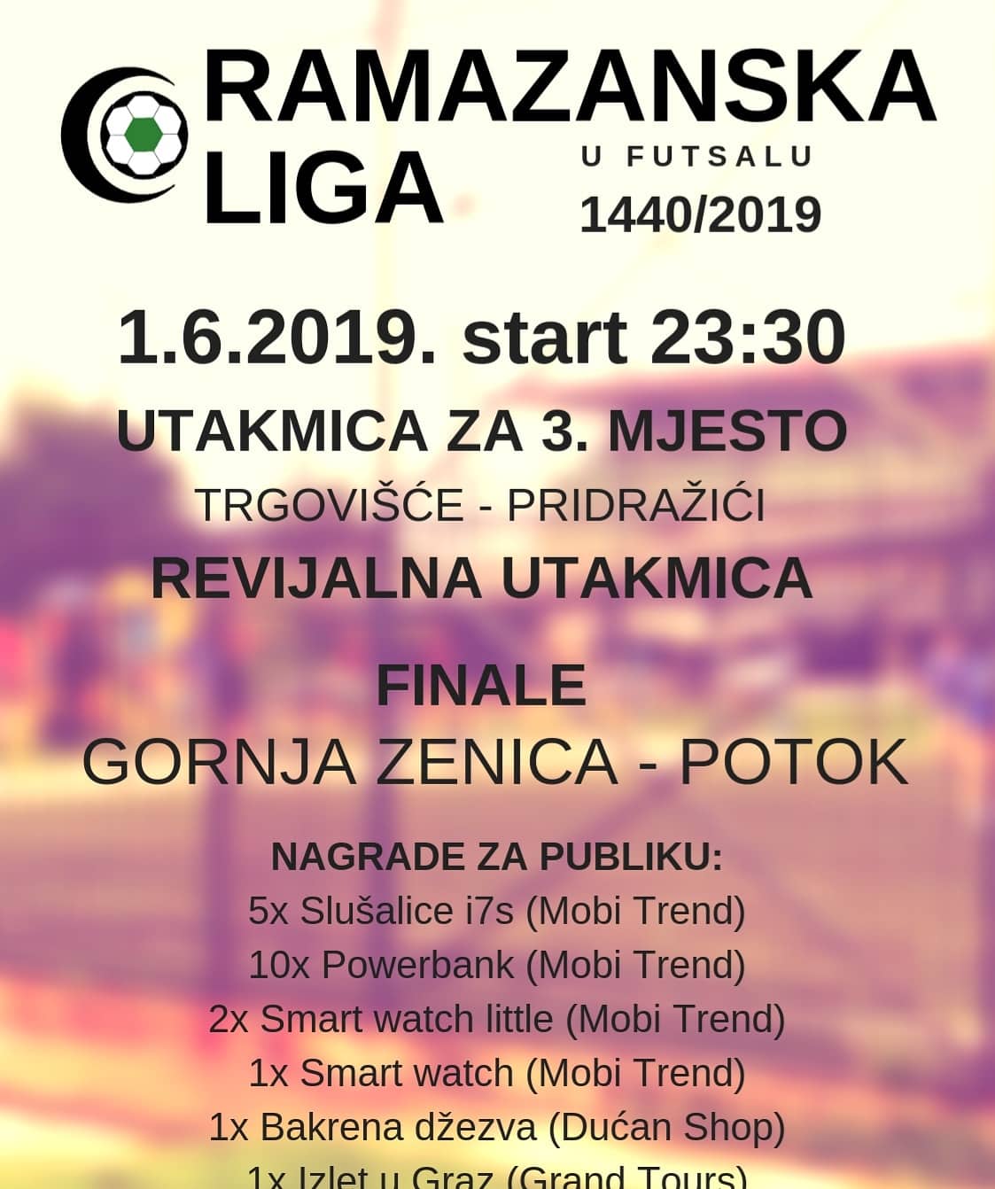Prva na programu je bila utakmica za treće mjesto koju su igrali ekipe Trgovišće i Pridražići. Nakon odličnih 24 minute i velike bitke na terenu, ipak je ekipa Pridražići uspjela da ostvari pobjedu rezultatom 1:2 i tako osvoji 3. mjesto u ovogodišnjem izdanju Ramazanske lige.