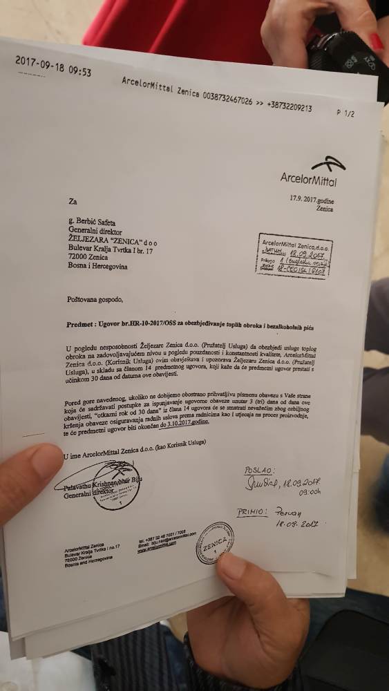 Direktor Safet Berbić, kako su nam saopštile žene zaposlene u radnoj jedinici Ishrana, pobjegao je pred njima svojim džipom. Nije želio da razgovara sa zabrinutim ženama koje su saznale da je ArcelorMittal Zenica poslao dopis da će sa 3. oktobrom raskinuti ugovor o ishrani svojih radnika. Radi se o najvećem prihodu Željezare. Danas je u telefonskom razgovoru sa novinarima rekao da on ne namjerava davati izjave i da će ovlastiti Hajrudina Mehića, svog pomoćnika za kadrovske i pravne poslove, da on da izjavu. Međutim, Mehić je u telefonskom razgovoru objasnio da je van zgrade na sastanku i da on ne može davati izjavu te uputio novinare na predsjednika Sindikata Esada Skomorca.