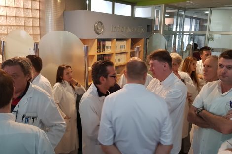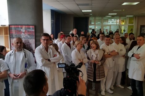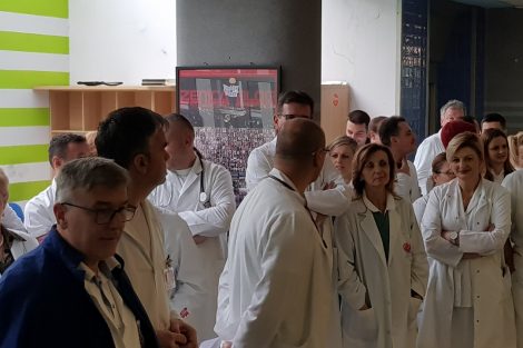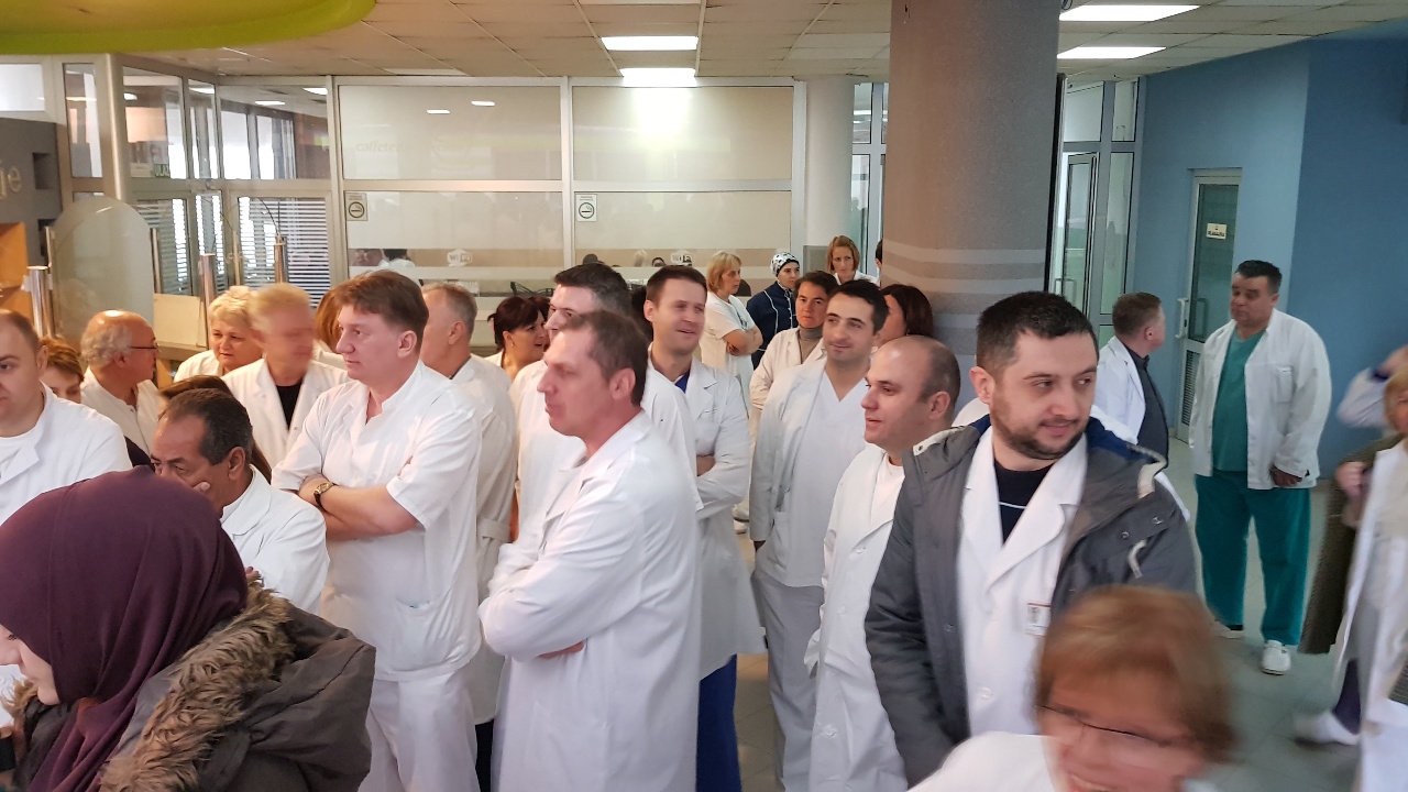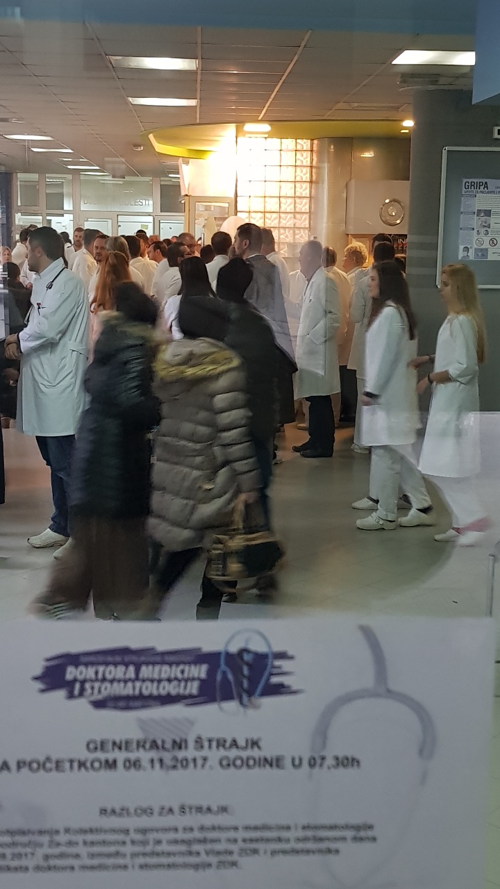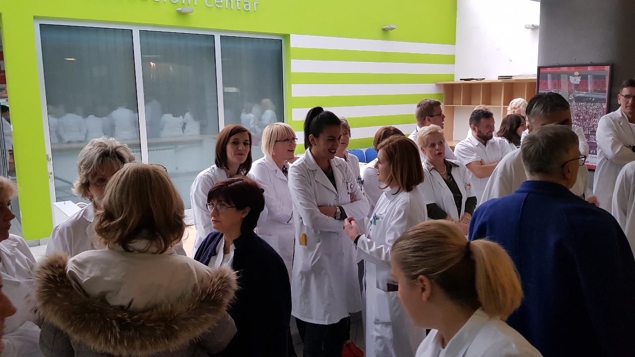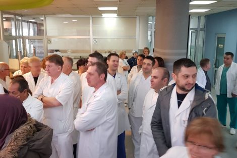 Protestno okupljanje ljekara Kantonalne bolnice Zenica – U Holu glavne zgrade Kantonalne bolnice Zenica održan je skup ljekara članova Sindikata doktora medicine i stomatologije ZDK.