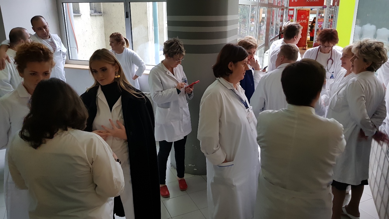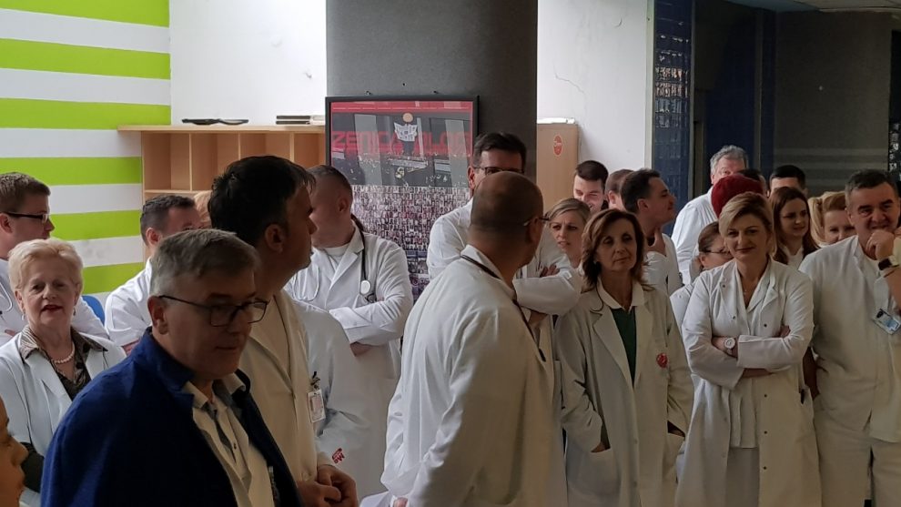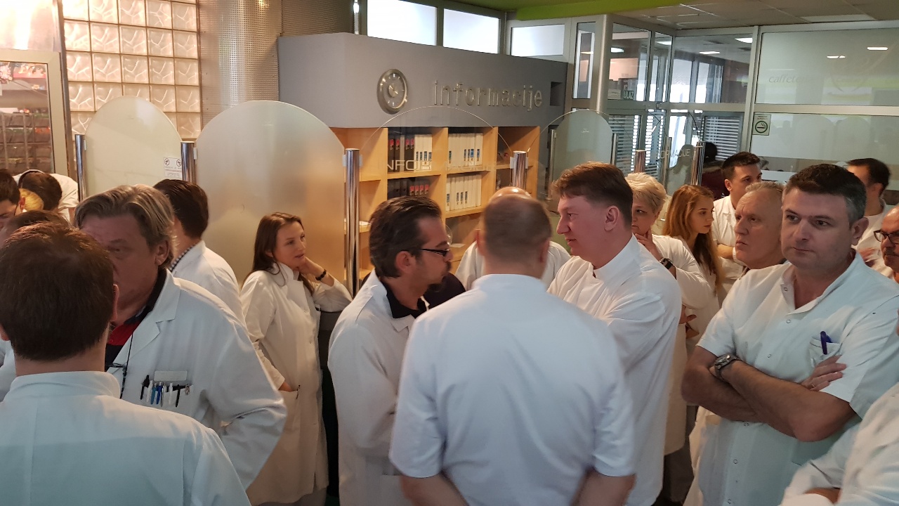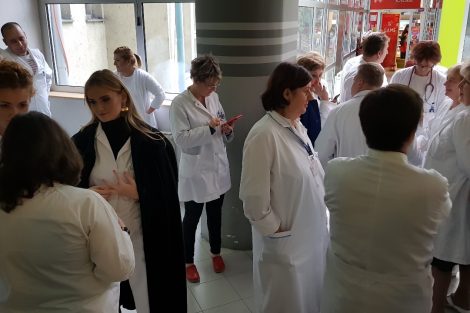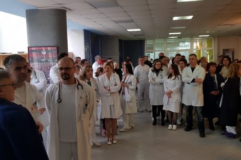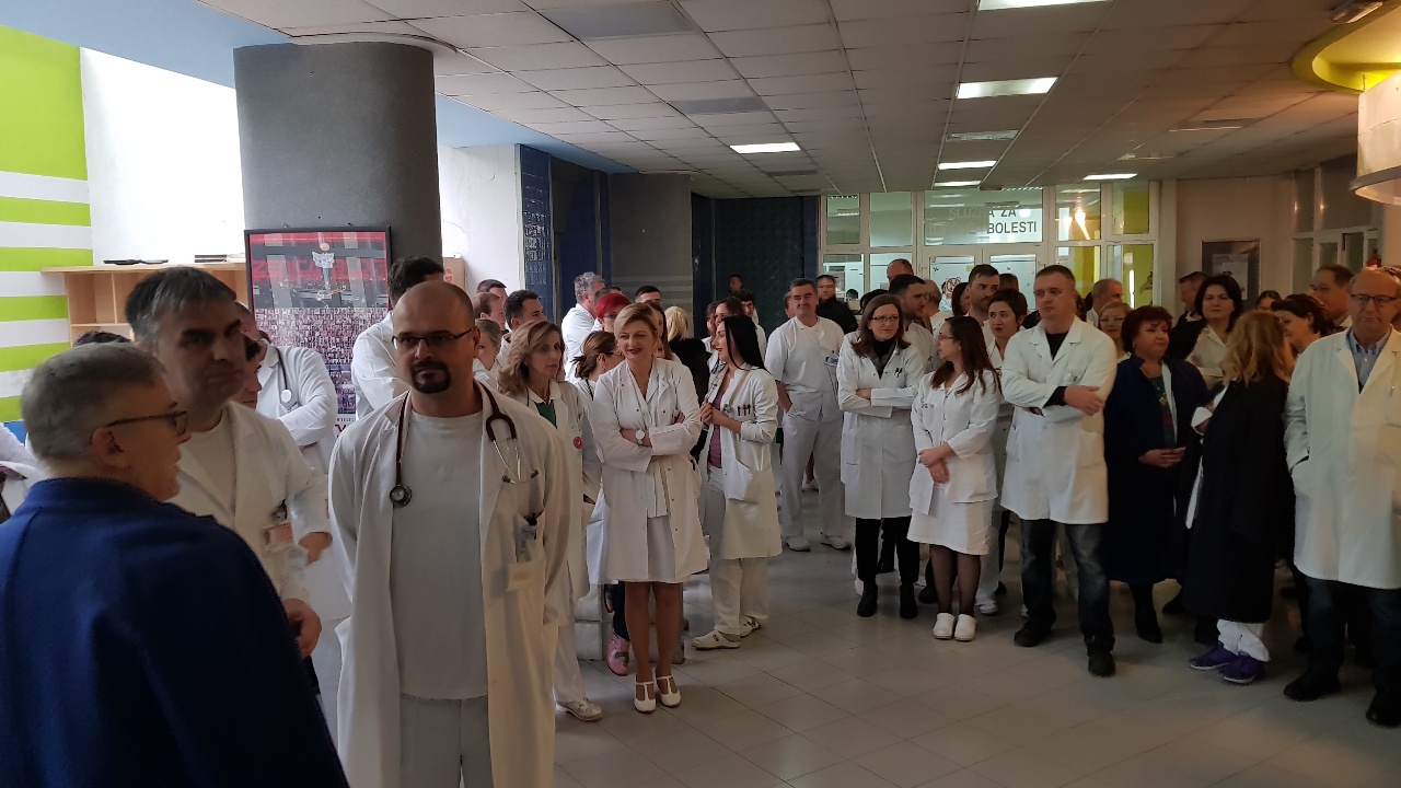 Protestno okupljanje ljekara Kantonalne bolnice Zenica – U Holu glavne zgrade Kantonalne bolnice Zenica održan je skup ljekara članova Sindikata doktora medicine i stomatologije ZDK.