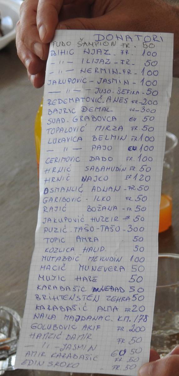 Bosanci sa švajcarskom adresom Šefika Topić, Šefik Puzić i drugi osigurali su po 900 švicarskih franaka i 50 eura za porodice komorata Damira Hrnjića, Zekerijaha Fetića i Mirnasa Babića. Više pogledajte u kratkim izjavama komorata, njihovog kolege Mehmeda Dizdarevića i upravnika jame Asmira Đuka.