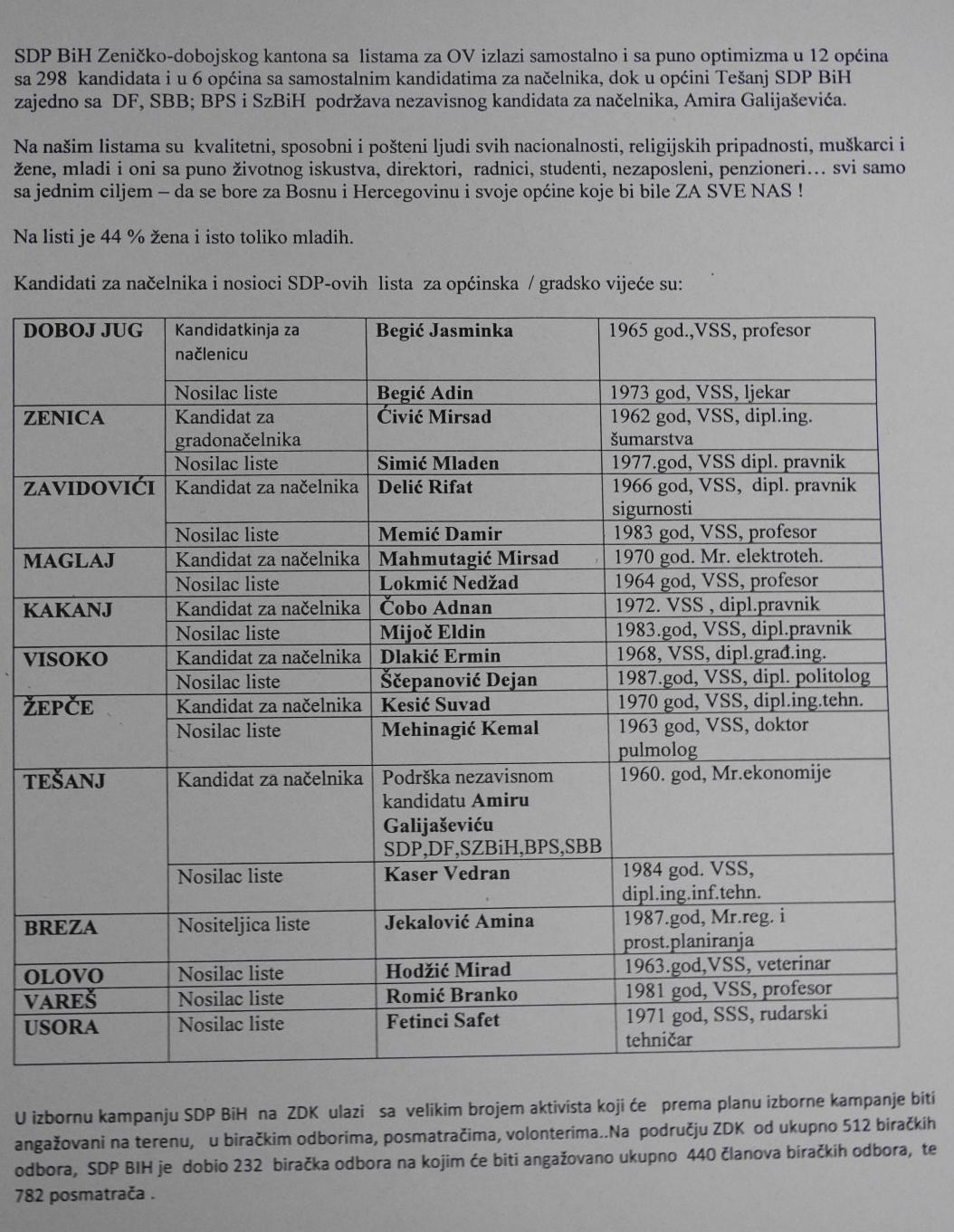 U Tešanju će SDP, zajedno sa DF-om, SZBiH, BPS-om i SBB-Fahrudin Radončić, podržati nezavisnog kandidata Amira Galijaševića, dok će nosilac liste za OV biti Vedran Keser.