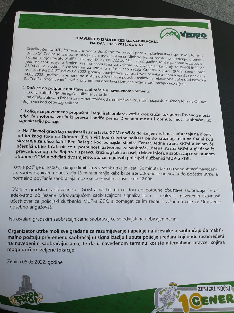 “Rasporedili smo volontere po segmentima same staze. Imamo jedanaest koordinatora koji će zadužiti po nekoliko volontera da blokiraju ceste, pomažu MUP-u ZDK da se cijeli događaj uskladi i koordiniše bez ikakvih problema. Apelujemo na građane Grada Zenica da, ukoliko nema potreba da izlaze sa vozilima, ne idu bez prijeke potrebe” dodao je član organizacionog odbora Kenan Hrustanović.