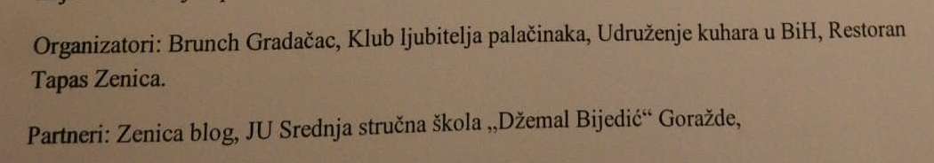 Ova manifestacija se po prvi put obilježava u Zenici, a učeštvovale su zeničke osnovne i srednje škole uz podršku brojnih sponzora te Udruženja kuhara Bosne i Hercegovine koji ocjenjuju napravljene palačinaka.