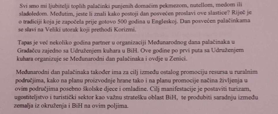 Ovo je manifestacija neprofitnog karaktera i učesnici su različite škole sa područja Zenice. Pripremaju se palačinke na različite načine te različiti takmičarski programi su ono što čini današnje obilježavanje ovog dana.