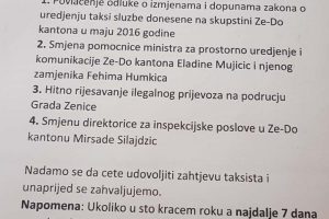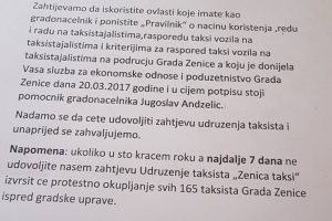 Od gradonačelnika Zenice, Fuada Kasumovića, zatraženo je da poništi Pravilnik o načinu korištenja, redu i radu, te rasporedu taksi vozila na taksi stajalištima i kriterijima za raspored taksi vozila na području Grada, koji je na osnovu izmjena Zakona donijela resorna gradska služba. Izraženo je uvjerenje da su novi propisi nametnuti pod pritiskom određenih interesnih grupa u Gradskoj upravi.