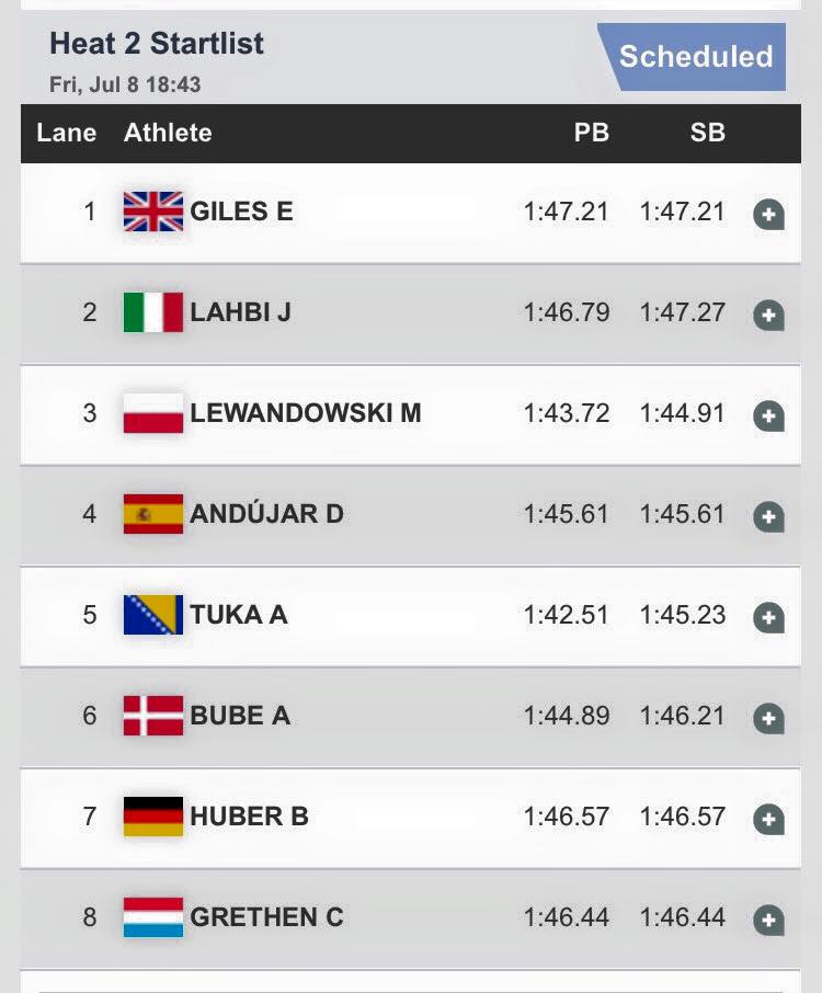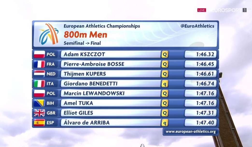 U finalu će učestvovati Adam Kszczot, Pierre-Ambroise Bosse, Thijmen Kupers koji su se u finale plasirali iz prve kvalifikacione grupe, zatim Marcin Lewandowski, Elliot Giles, te naš Amel Tuka iz druge dok su po vremenu, plasman u Giordano Benedetti i Alvaro de Arriba iz prve kvalifikacione grupe koji su po vremenu ostvarili plasman u finale.