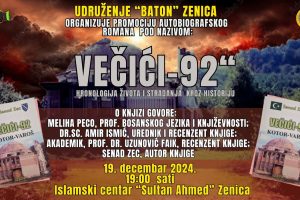 U cilju isticanja značaja historijskih događaja i očuvanja sjećanja na kontinuirani genocid nad Bošnjacima, Udruženje „Baton“ Zenica je u četvrtak 19.12.2024. godine u prostorijama Islamskog centra “Sultan Ahmed” u Zenici organizovalo promociju knjige pod nazivom: “VEČIĆI-92 HRONOLOGIJA ŽIVOTA I STRADANJA KROZ ISTORIJU”
