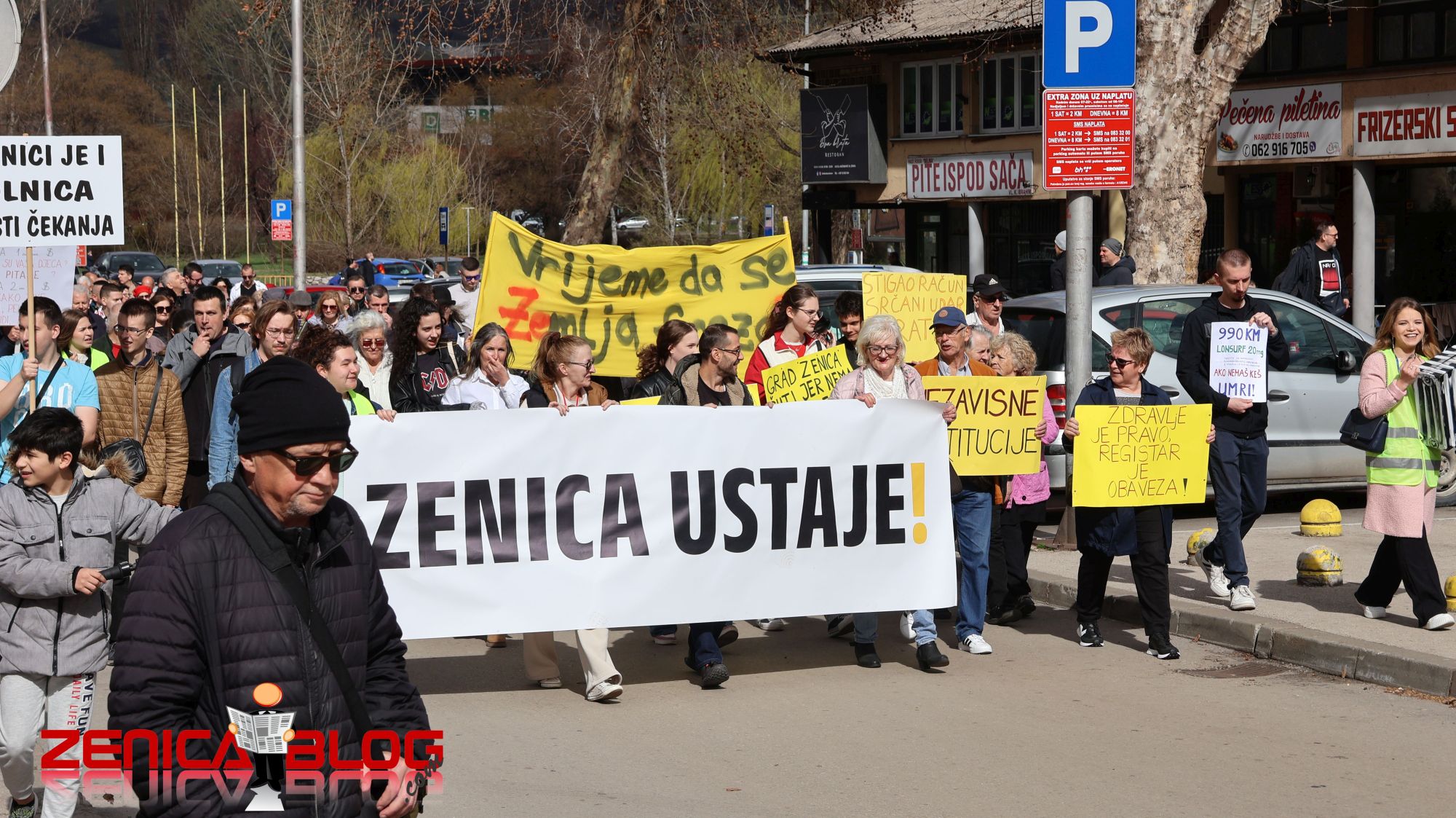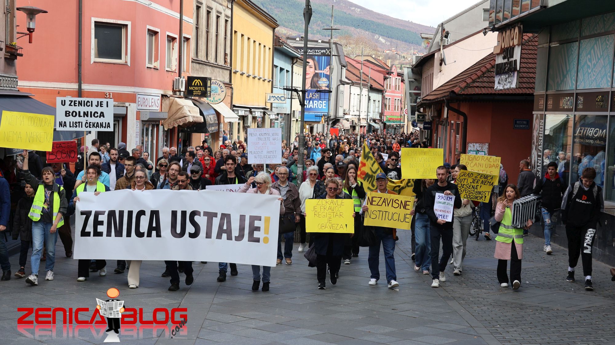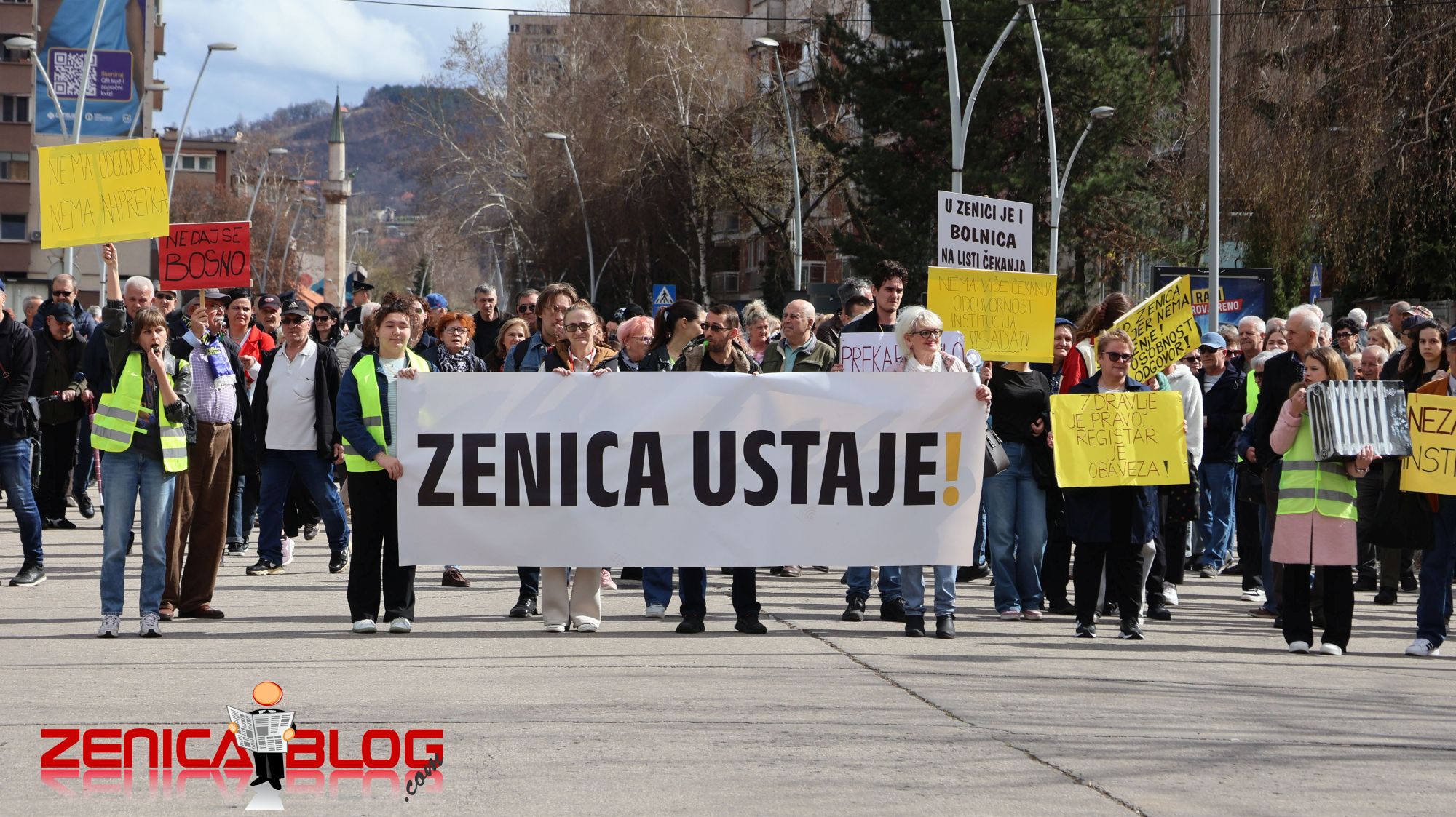 Nakon pet nedjeljnih skupova i mirnih šetnji u organizaciji Neformalne grupe „Zenica ustaje“, prvi put mirni skup u tom gradu danas je organiziran i radnim danom, a na Trgu „Alije Izetbegovića“ i ulicama tog grada protestiralo je oko 500 osoba.