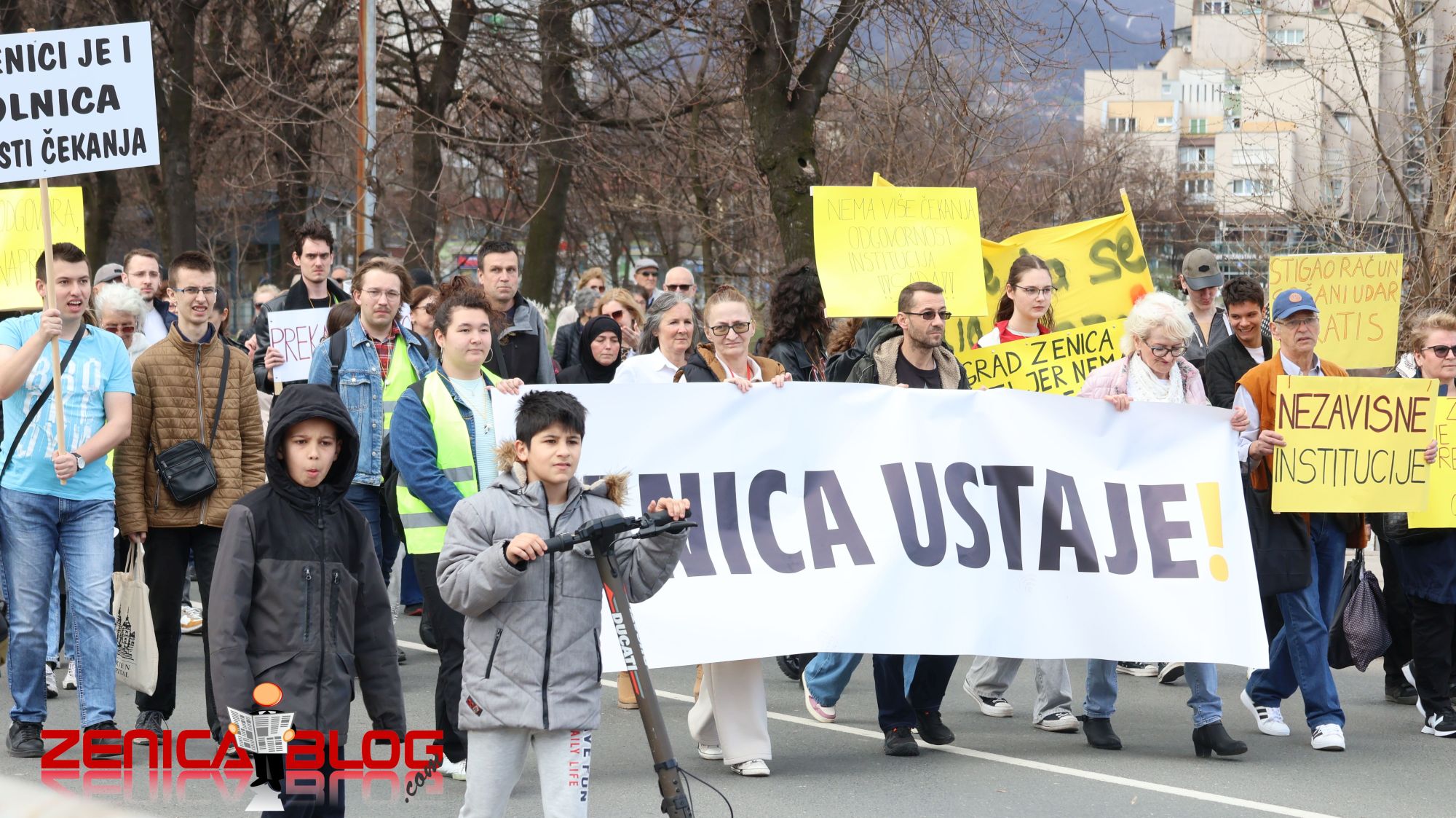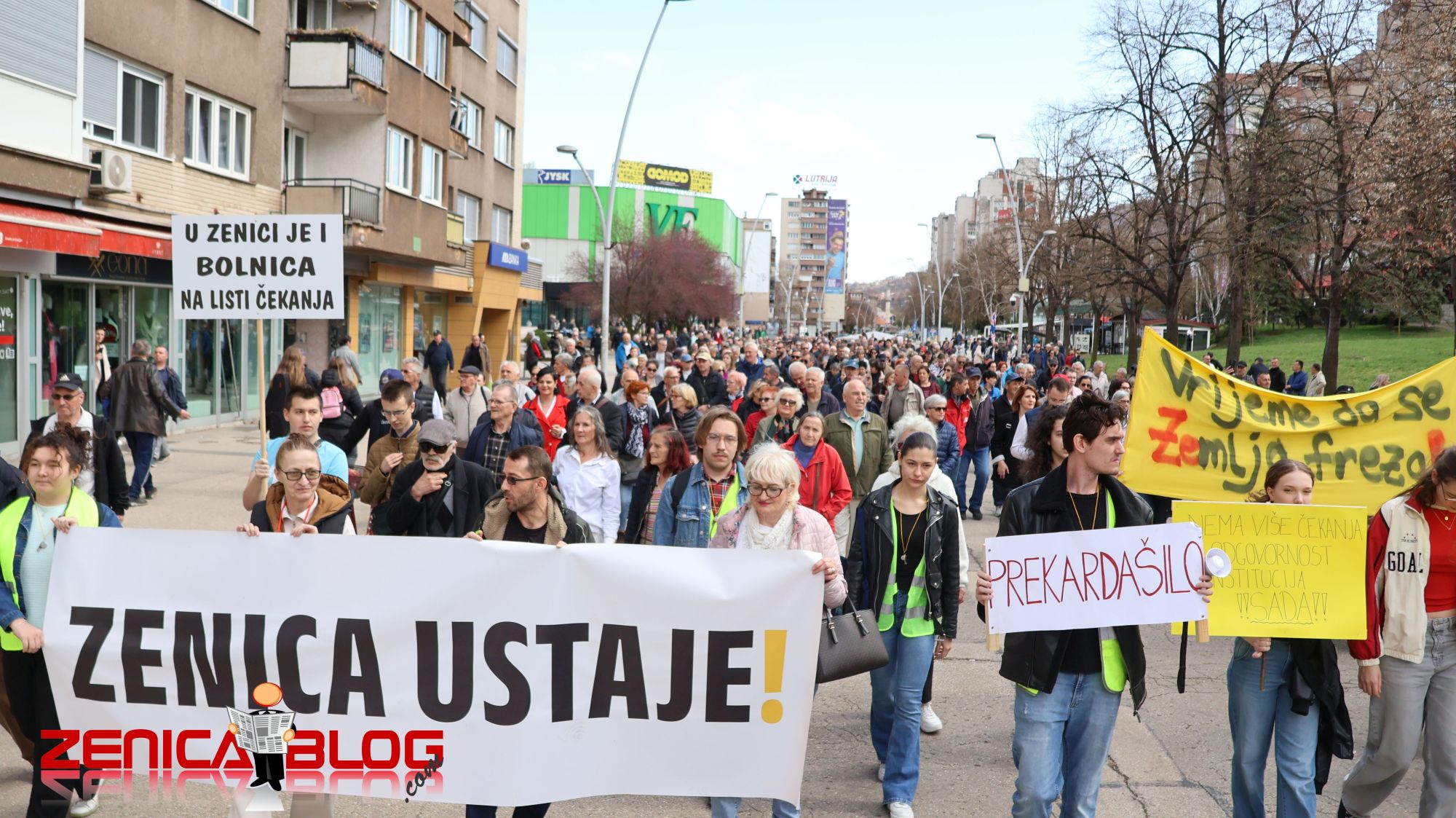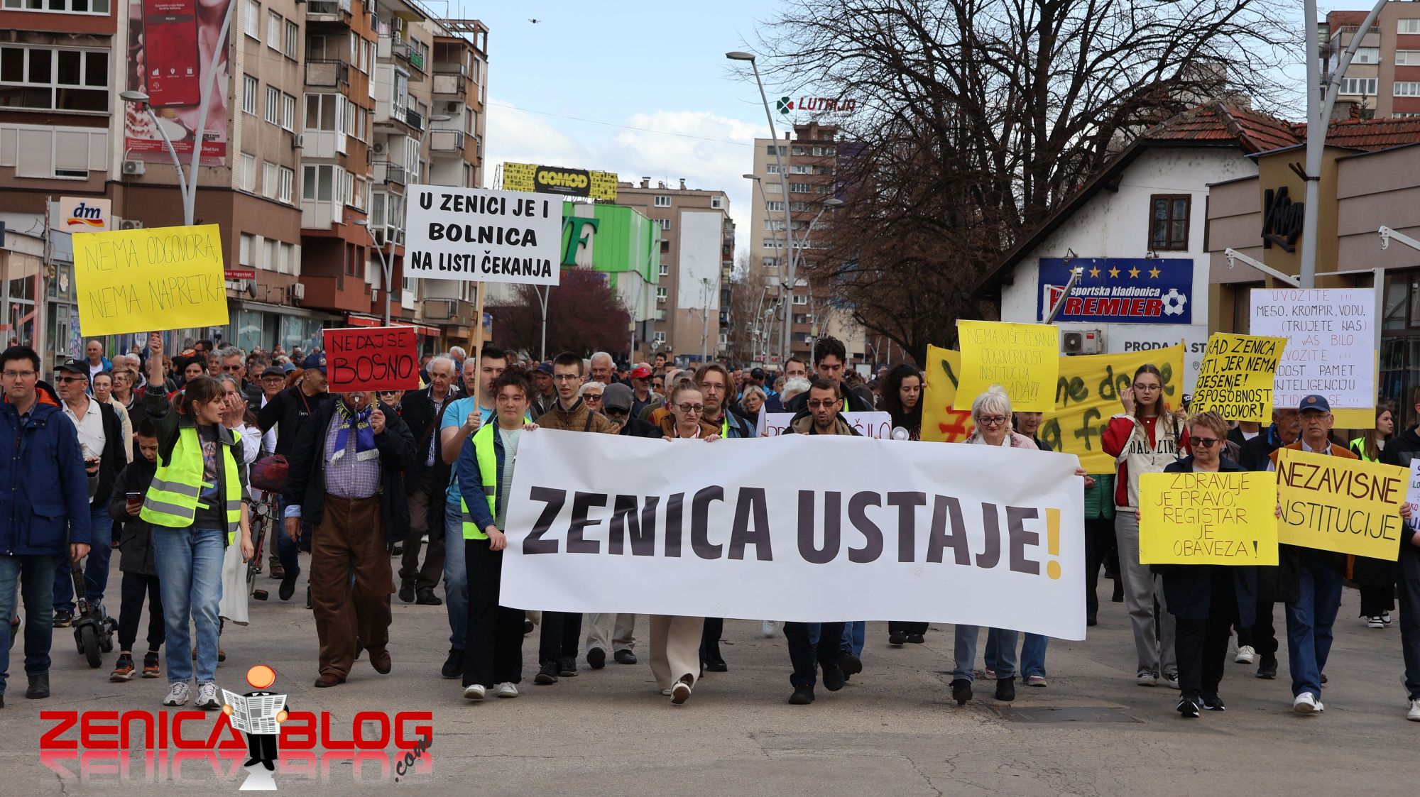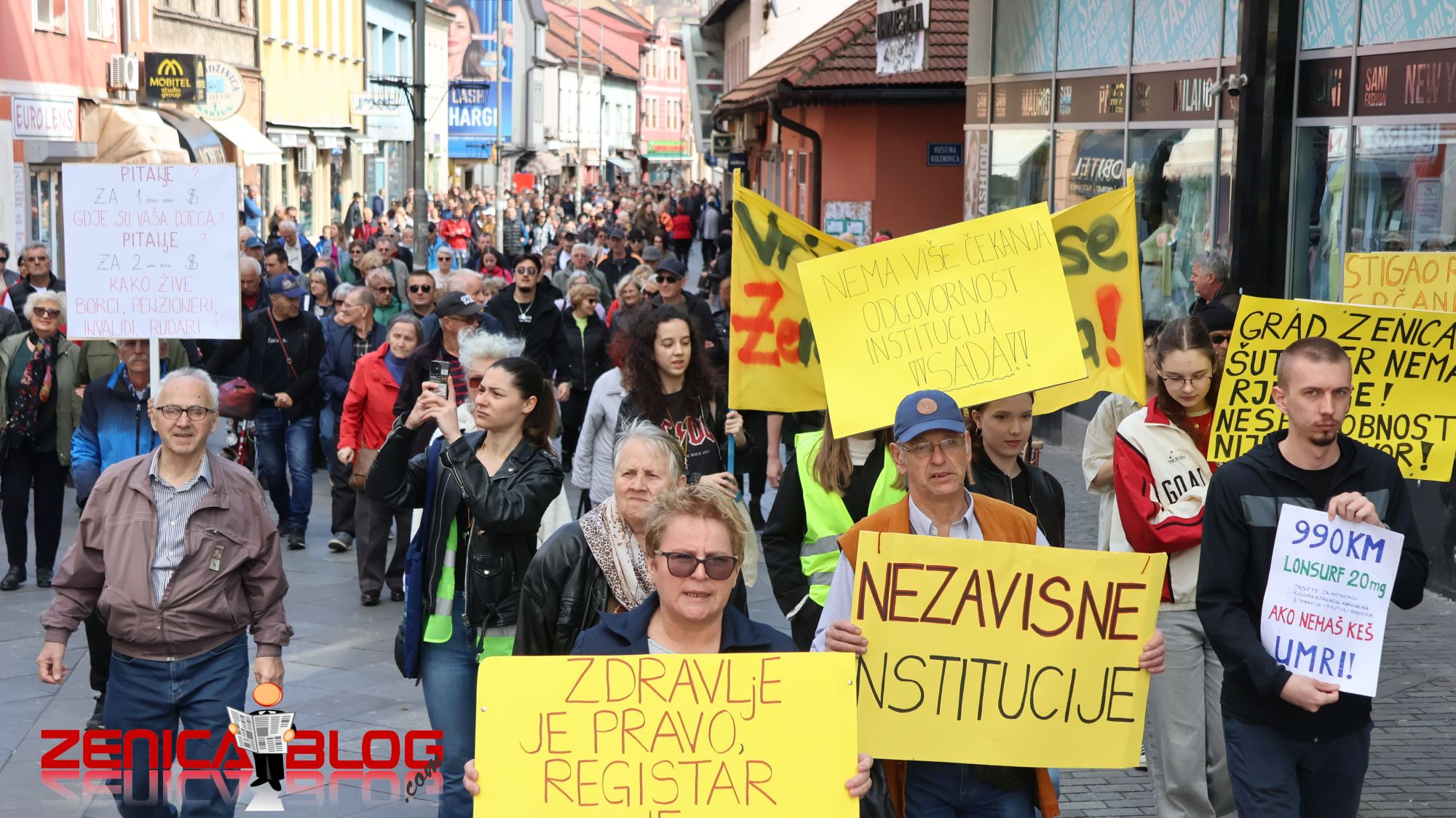 Nakon pet nedjeljnih skupova i mirnih šetnji u organizaciji Neformalne grupe „Zenica ustaje“, prvi put mirni skup u tom gradu danas je organiziran i radnim danom, a na Trgu „Alije Izetbegovića“ i ulicama tog grada protestiralo je oko 500 osoba.