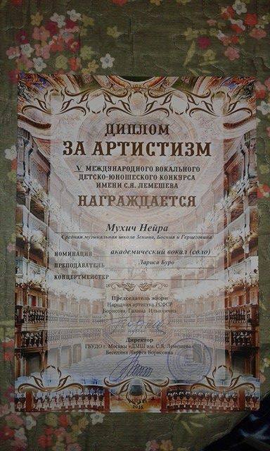 VIDEO+FOTO: Zeničanka Neira najbolja solo pjevačica među 270 učesnika u Moskvi – Neira Muhić, maturantica na odsjeku solo pjevanje u klasi profesorice mezzo sopranistice Larise Buro /Srednja muzička škola Zenica/, sa Internacionalnog takmičenja solo pjevača nazvanom po solisti Bolshoi teatra tenoru ‘‘Sergei Yakovlevich Lemeshev” u glavnom gradu Rusije, Moskvi, u Zenicu se vratila sa Grand Prixom i osvojenih maksimalnih 100 bodova.