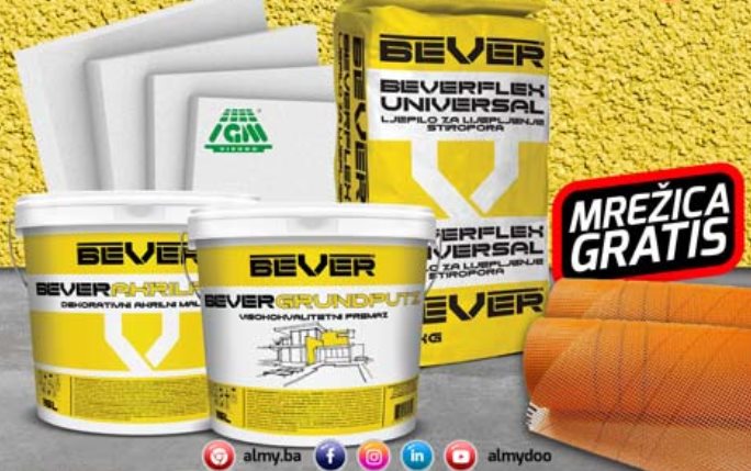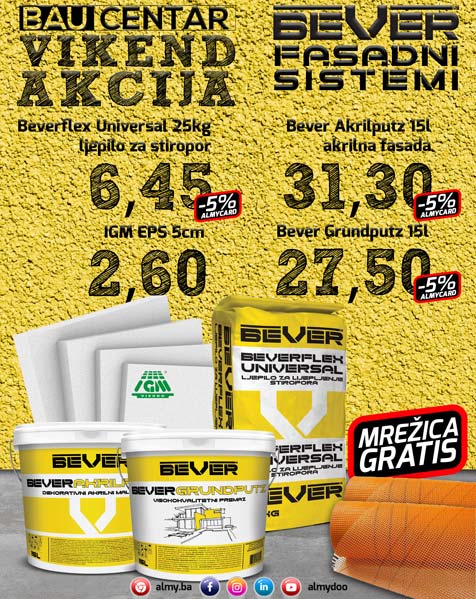 Cijenjeni kupci kompanije Almy, za Vas smo spremili novu vikend akciju u našim Bau centrima u Zenici, Zavidovićima i Nemili. Za kupovinu kompletnog BEVER fasadnog sistema dobijate fasadnu mrežicu GRATIS.