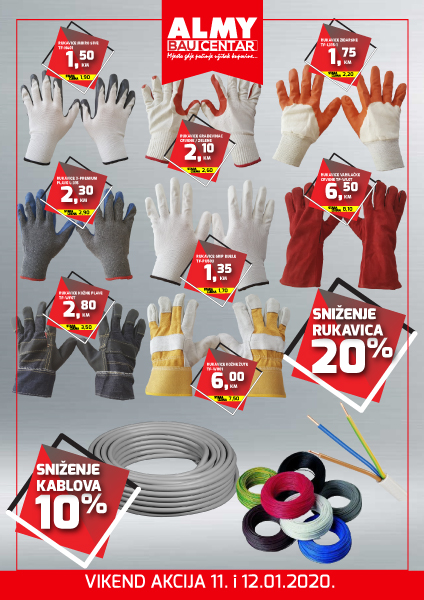 Vikend akcija u Bau centrima kompanije Almy – “Vikend akcija u Bau centrima kompanije Almy! Posjetite naše Bau centre u Zenici i Zavidovićima, za Vas smo spremili sniženje radnih rukavica od 20% i kablova za 10%. Akcija traje 11 i 12.01.2020. god.